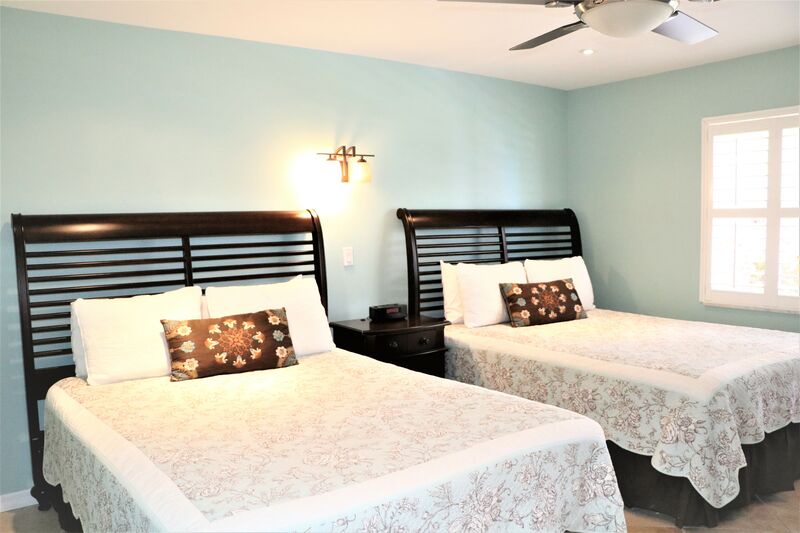 The spacious primary bedroom includes two cozy queen beds, providing ample space for couples to relax and store luggage. The modern bathroom boasts high-end fixtures, ensuring a luxurious and relaxing experience.