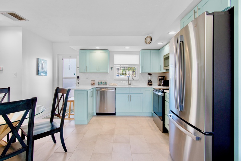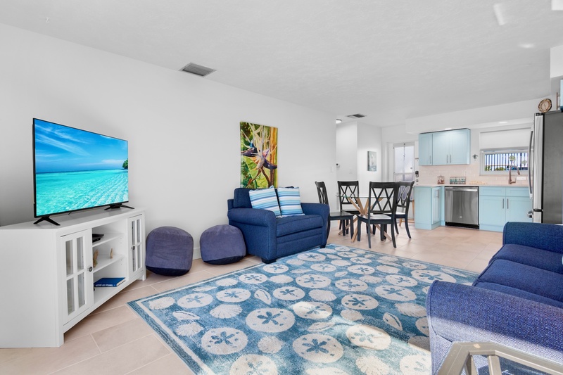 This charming condo features an updated interior with bright coastal decor and comfortable furnishings. The open living room includes a queen sleeper sofa, ample seating, and a TV, perfect for relaxing after a day at the beach. The fully equipped kitchen provides everything you need for preparing meals, while the dining area is ideal for enjoying breakfast before heading out to explore Siesta Key.
