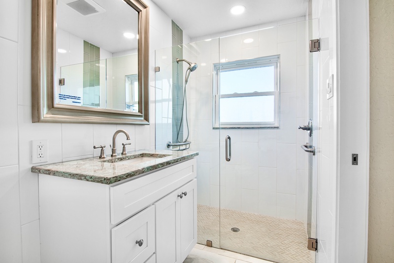 Very accessible expanded bath with curb-less entry into an oversized 36” x 60” shower with non-slip herringbone tile floor, equipped with oversized two-way-swing glass door and ample grab bars. Larger vanity with additional storage for guest beauty aids.