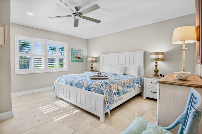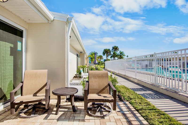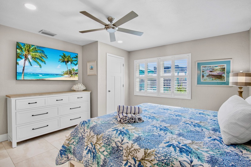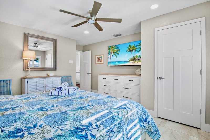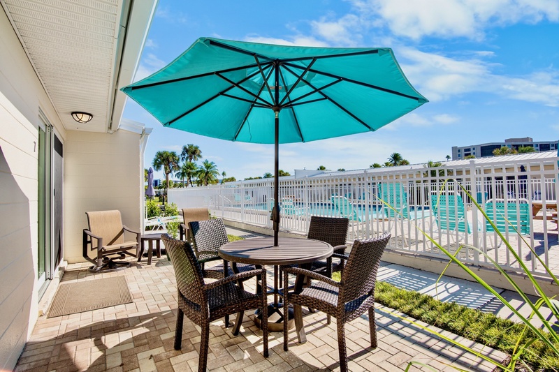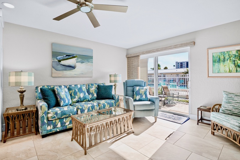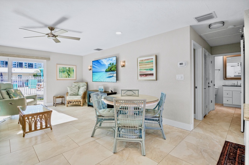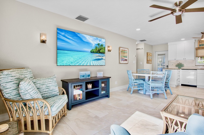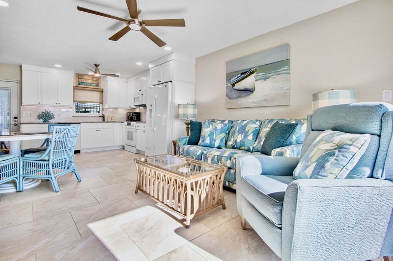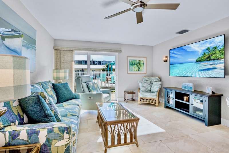 Convenient access to Pool #2, only 15 feet from your patio. Easy stroll to the beautiful white quartz sand Siesta Key beach. This new unit features refreshing mid-century coastal décor throughout. A truly amazing glare-free 75” smart TV with DIRECTV PREMIER streaming channels & all your favorite apps in the living room – watch programs and mega sports package (HBO, STARZ, Showtime, Cinemax, NFL Red Zone, MLB Strike Zone and more) from any angle in the LR with the slider privacy panels fully opened.