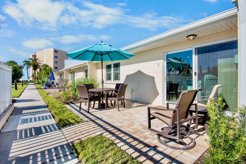 There’s an expanded patio on the east side with dining table, umbrella and swivel chairs for morning coffee on the ‘sunny’ side. Or relax in the shade in the mornings on the west side patio.