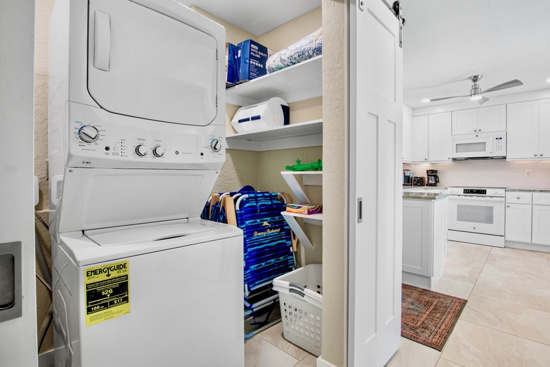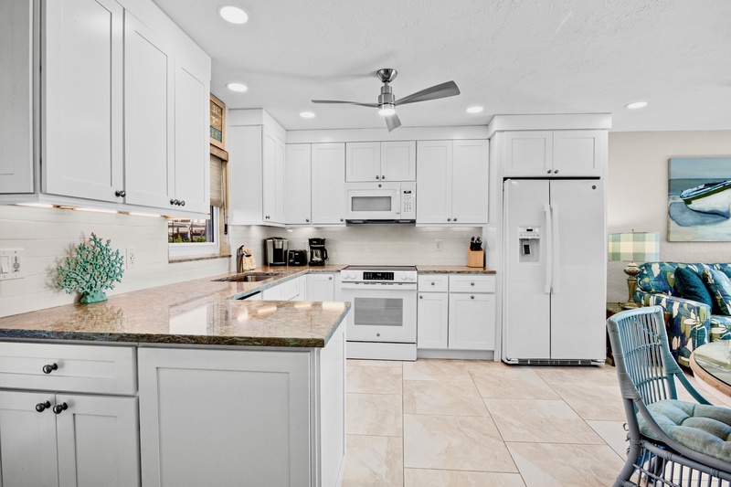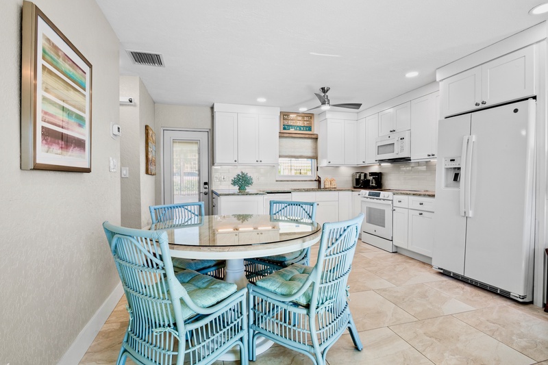 All new kitchen with Cambria solid surface counters, GE Monogram appliances. Roomy round dinette with 48” glass top for easy living with 6 chairs. Ample guest storage in the utility room – includes 4 Tommy Bahama folding beach chairs for guest exclusive use. The complement of beach toys (skim board, boogie board, pool noodles, inflatable floats) all live in the utility closet with the washer-dryer and Dyson stick vac (the best way to vac up that lovely white quartz sand from the beach).