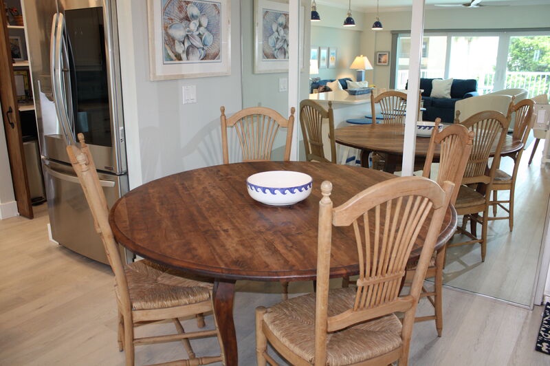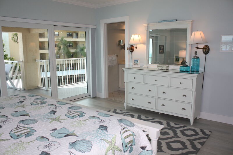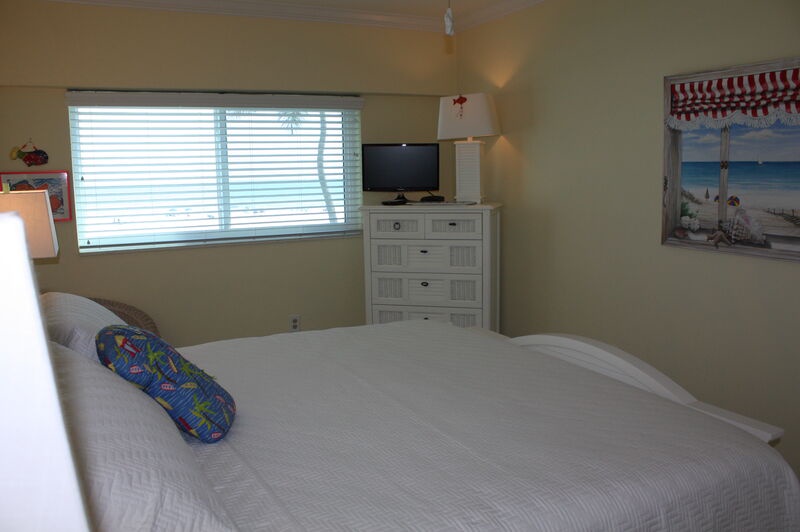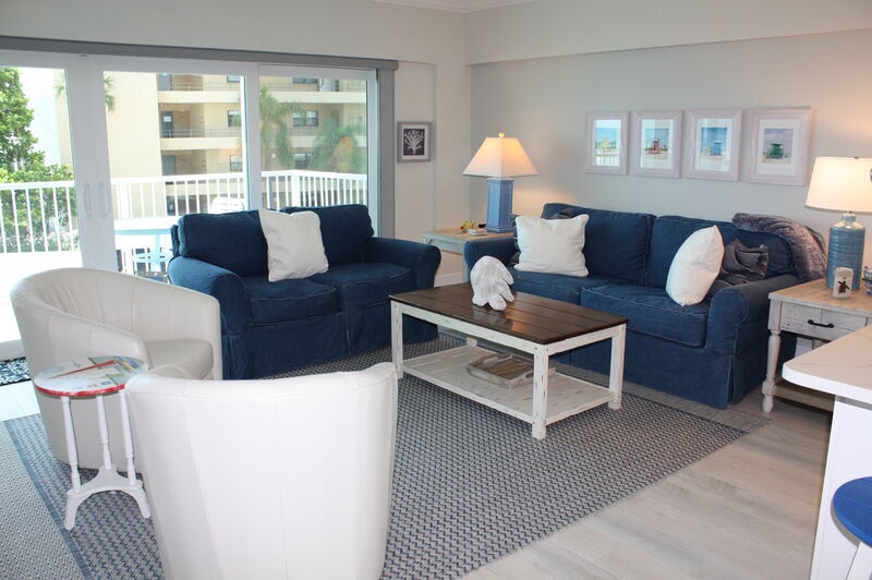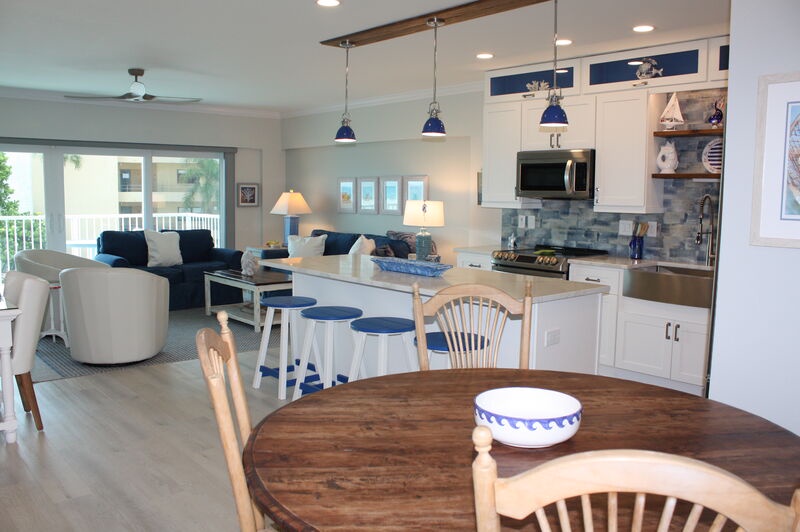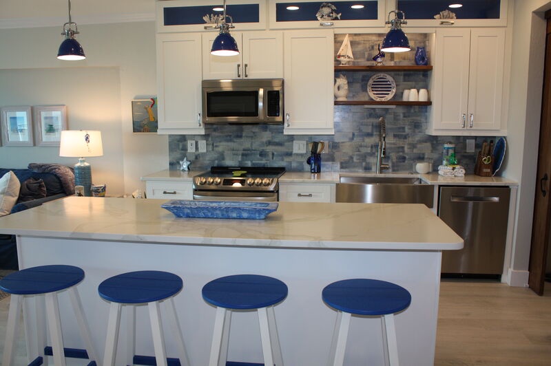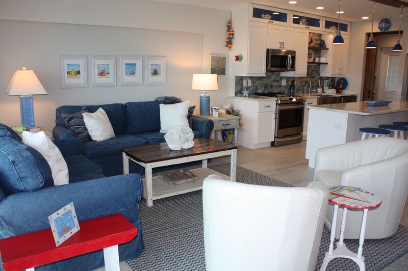 Step inside and find a comfortable, welcoming living space where you can unwind after a day at the beach. The modern kitchen is perfect for preparing meals, featuring updated appliances and an island with bar seating. Gather around the dining table for delicious family meals or enjoy scenic views from your balcony seating as you dine together. Both bedrooms are designed for your comfort, offering cozy furnishings, TVs, and ample storage to ensure a restful stay. The primary bedroom includes an ensuite bathroom for added convenience, while the guest bedroom is easily accessible to the second bathroom.