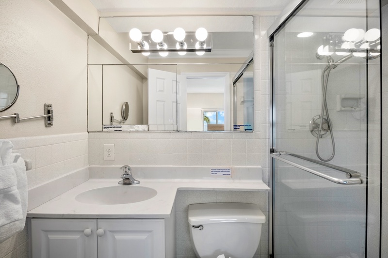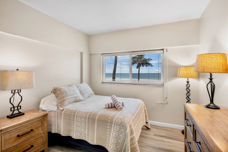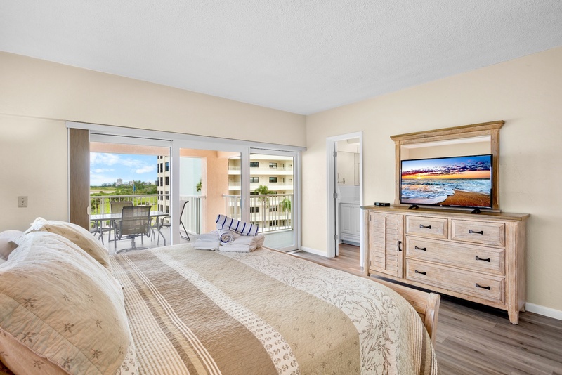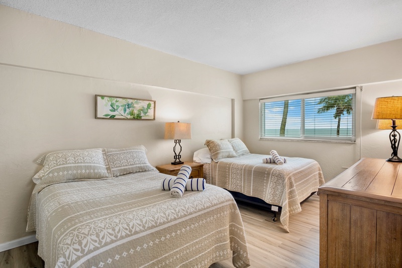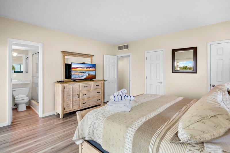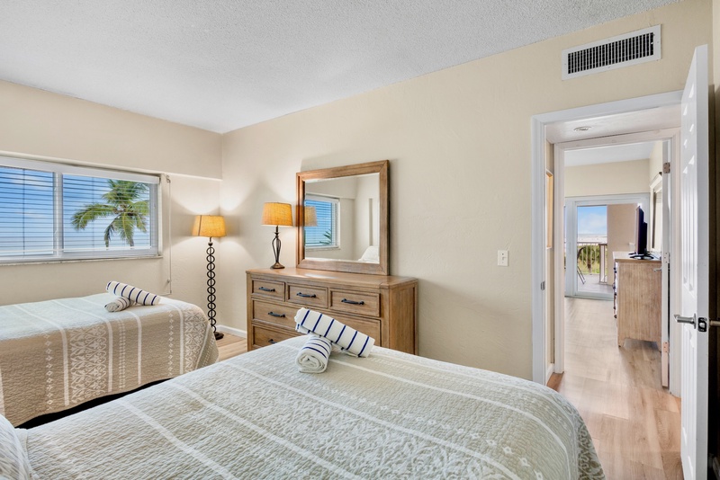 The primary bedroom features a king bed, TV, private balcony access, and an ensuite bathroom with a walk-in shower. The guest bedroom includes two full beds, a TV, and easy access to the second bathroom, which offers a shower/tub combo. Both bedrooms are designed with guest comfort in mind, featuring plush linens, ample storage, and coastal-inspired touches.