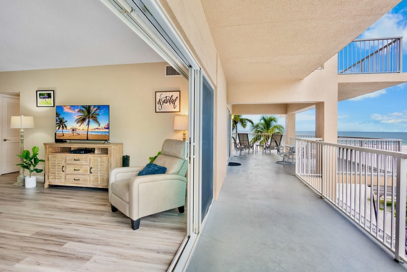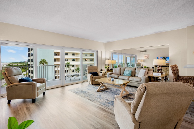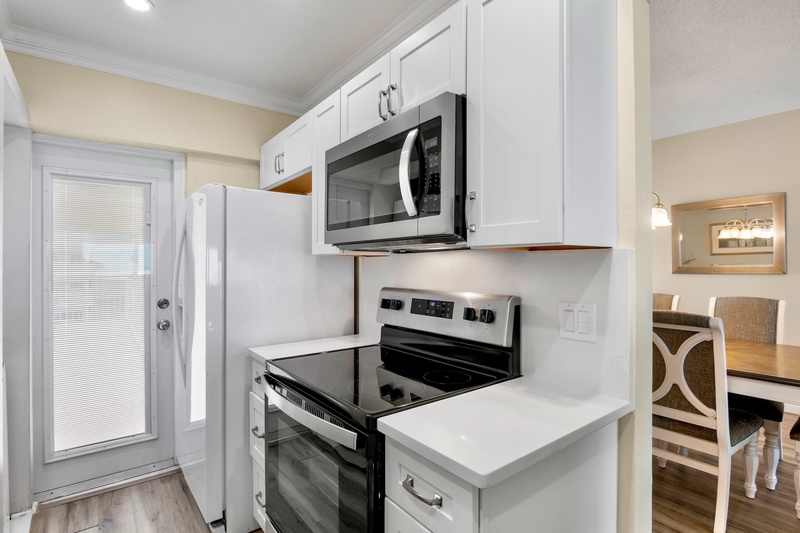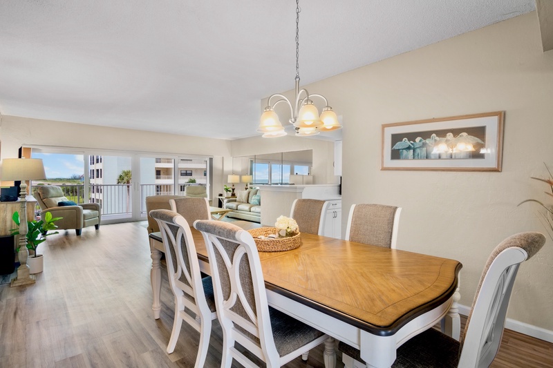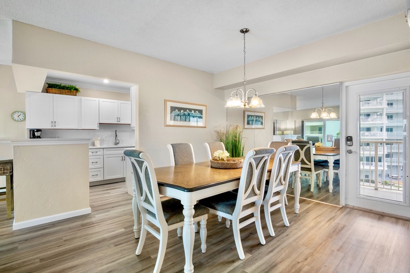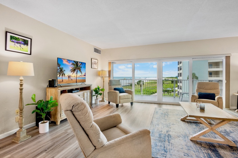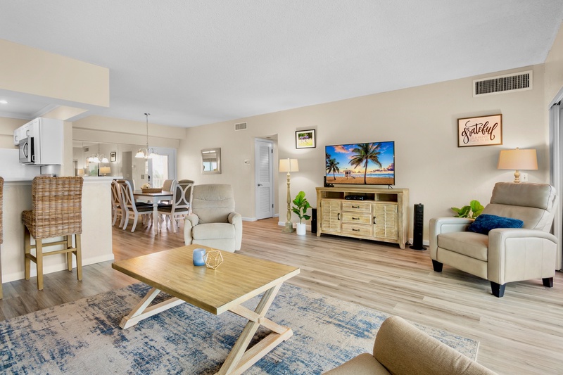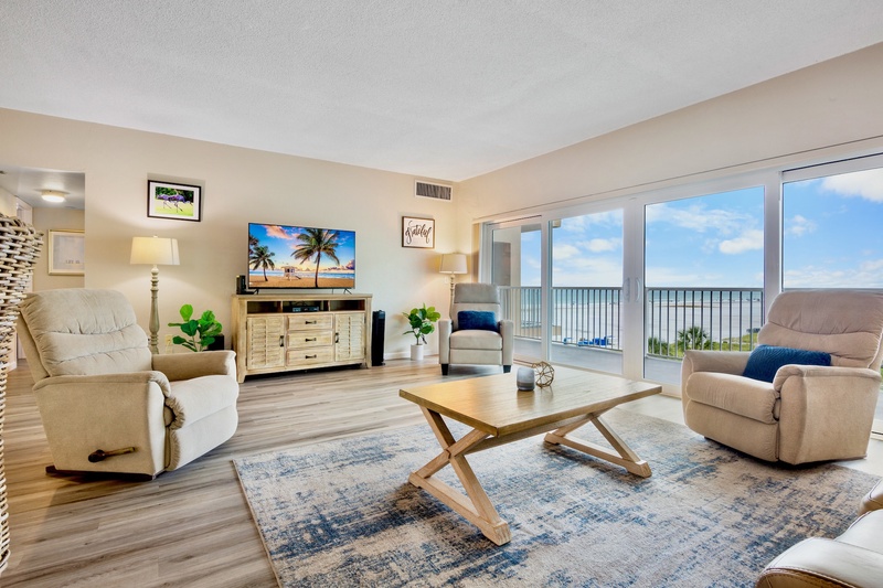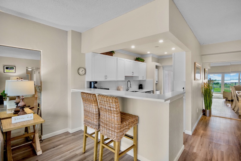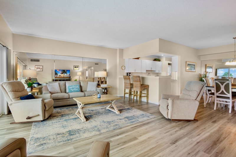 Step inside and experience a bright, open living area filled with natural light and modern coastal decor. Large windows and sliding doors showcase incredible Gulf views, creating a relaxing backdrop for your stay. The living room offers comfortable seating and a Smart TV, while the fully equipped kitchen includes all the essentials for home-style cooking, plus a dining area for shared meals. Enjoy dining inside or step out onto the private balcony to savor your morning coffee or a sunset cocktail while watching the waves.