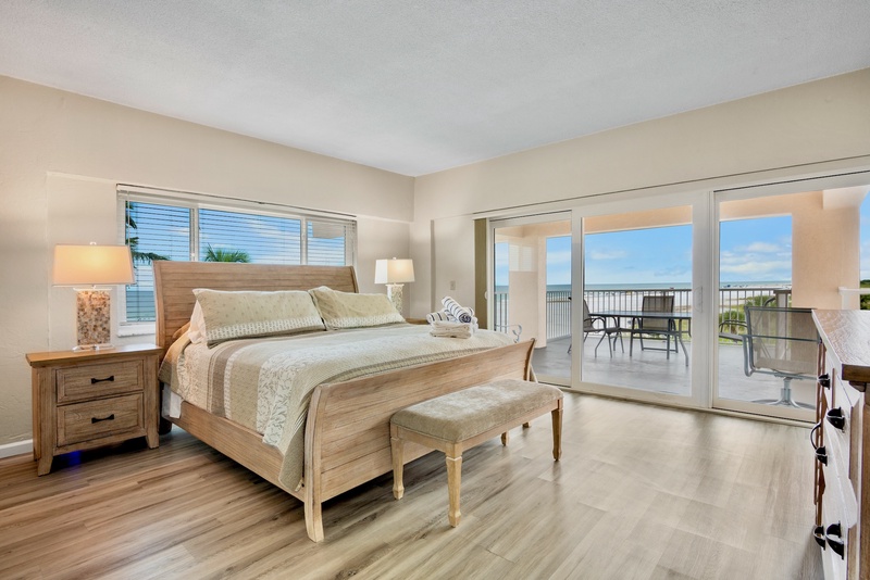 • Primary Bedroom: King bed, balcony access, ensuite bath with walk-in shower