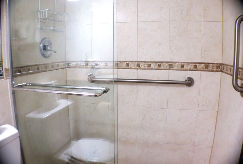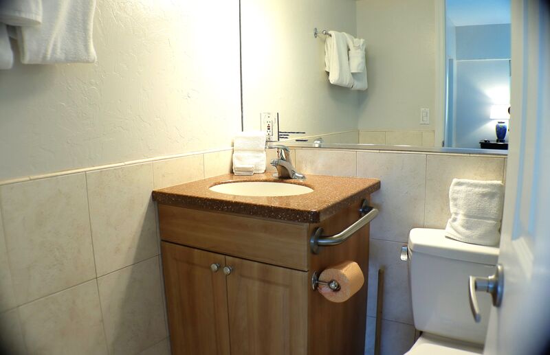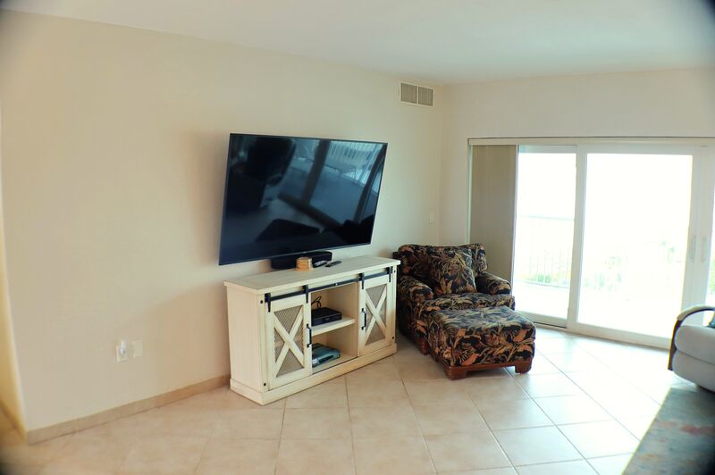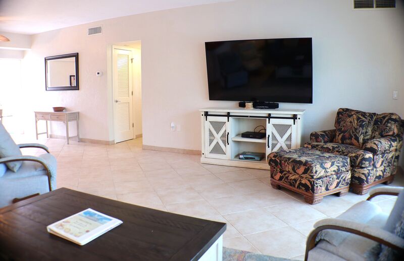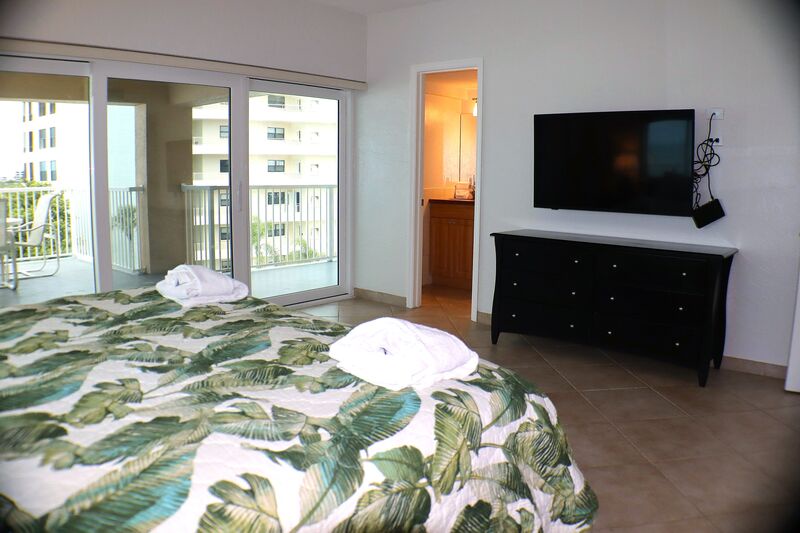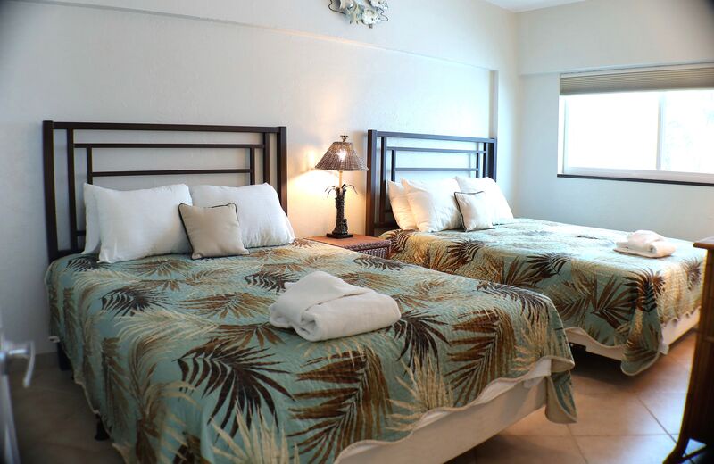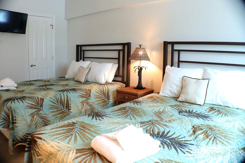 The primary bedroom features a king-sized bed, ensuite bathroom, and direct access to the outdoor patio. The additional bedroom is thoughtfully furnished with two queen beds, ensuring comfort for every guest. Each bedroom is equipped with fresh linens, a TV, and ample storage space for your convenience, providing a restful retreat after your exciting beach days.