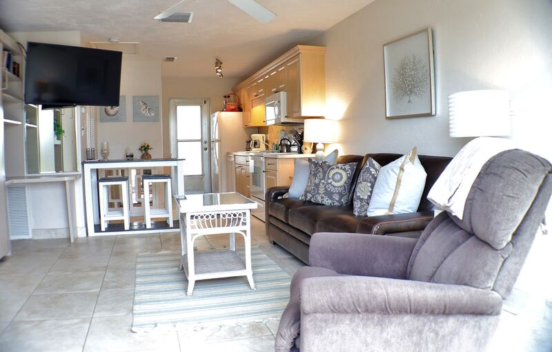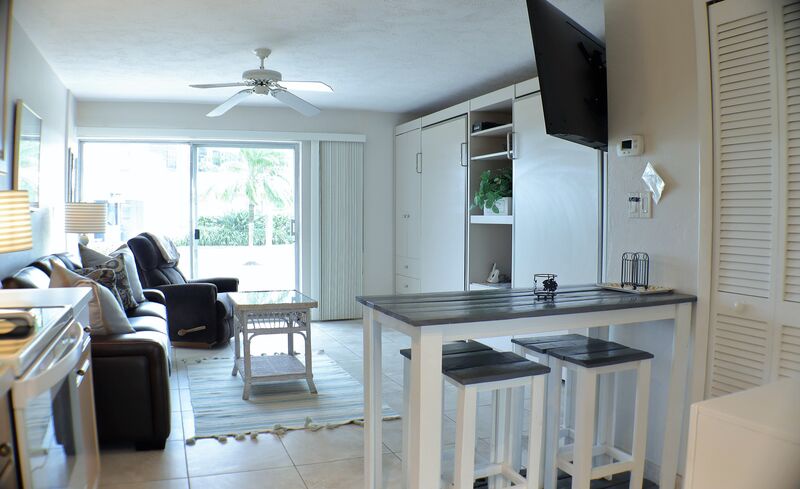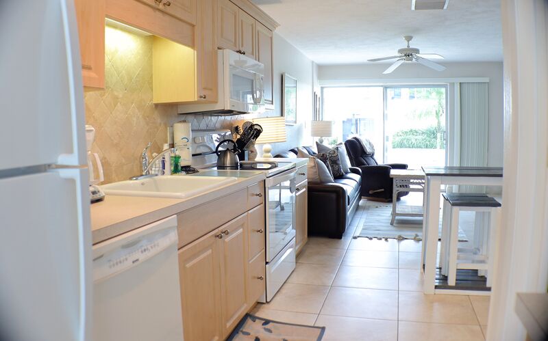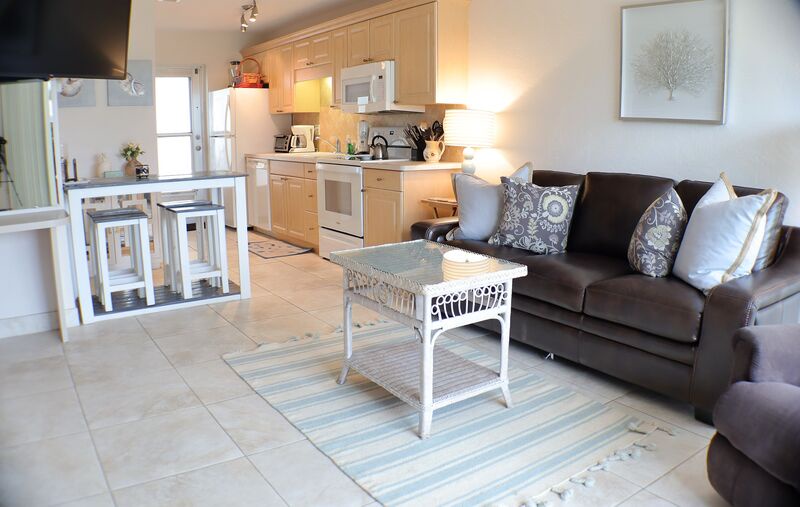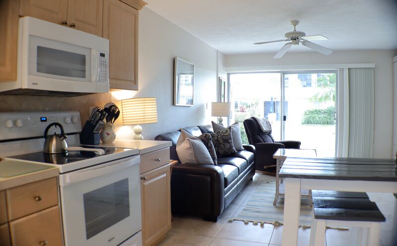 Come and enjoy this updated studio garden view unit with all the amenities expected of a larger condo, located in the garden/pool area of our beautifully landscaped property. Enjoy the white crystal sandy top rated #2 beach in the world. Before you are ready to kick back and relax with the sunset, play a game of shuffleboard, enjoy a barbeque, or take a swim in any of our 3 heated pools on the grounds. This unit has its own beach umbrella. There is a new queen sleeper sofa with a memory foam mattress, along with the 2 twin murphy beds. This unit has a 7 night minimum Saturday to Saturday rental policy, but can be booked for less to fill gaps. We will do our best to accommodate any request.
