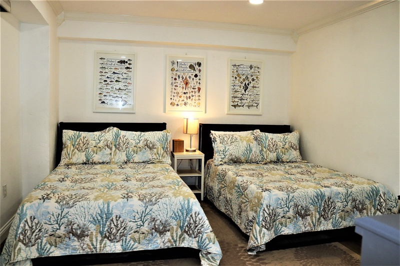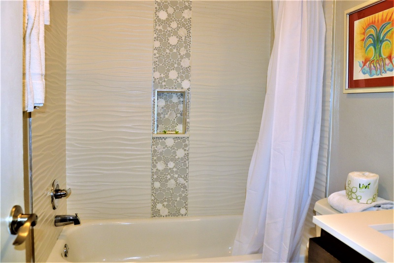 Jamaica Royale 204 includes a spacious primary bedroom with a king bed and an ensuite bathroom that features a convenient walk-in shower. The second bedroom is perfect for kids, furnished with two full-size beds. The hall bathroom includes a shower-tub combo, providing ample space for everyone to prepare for beach adventures.