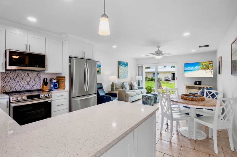 This newly updated condo blends coastal comfort with modern upgrades. The open living area features new furnishings, a queen sleeper sofa, and a flat-screen TV for relaxing evenings. The fully equipped kitchen is beautifully renovated with granite countertops, white cabinetry, and stainless-steel appliances, making it easy to prepare home-cooked meals or quick beach snacks. Porcelain tile flooring runs throughout, creating a bright and airy atmosphere.