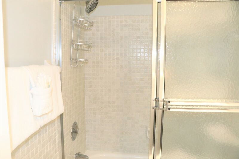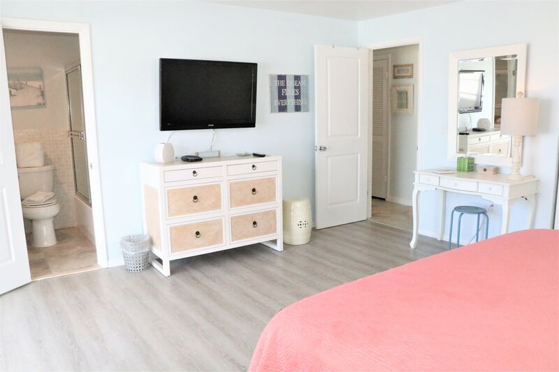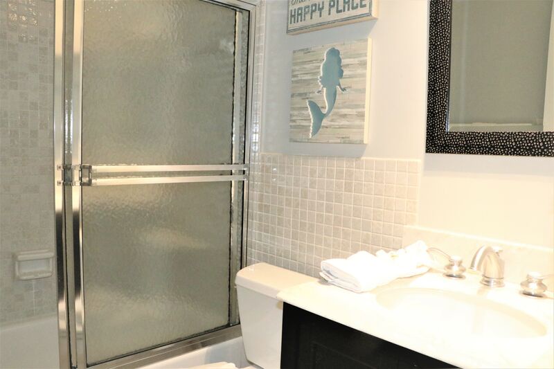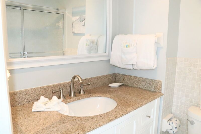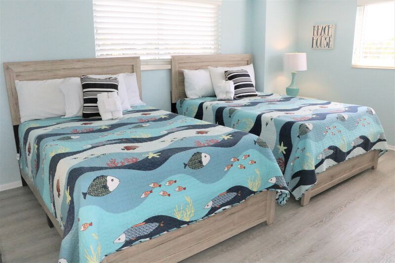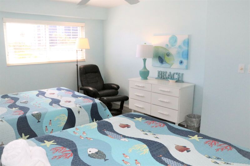 The primary bedroom features a king bed and an ensuite bathroom with a shower-tub combo. The second bedroom is perfect for kids, furnished with two full-size beds. A second bathroom features a shower-tub combo for added convenience, making it easy for everyone to get ready for beach outings.