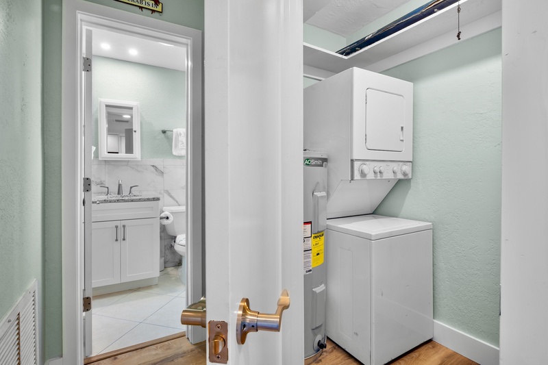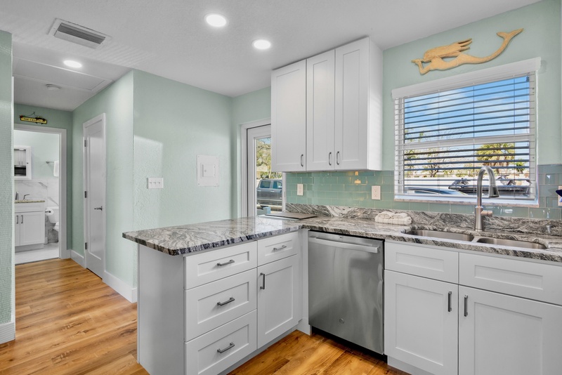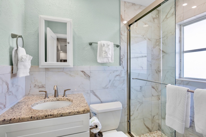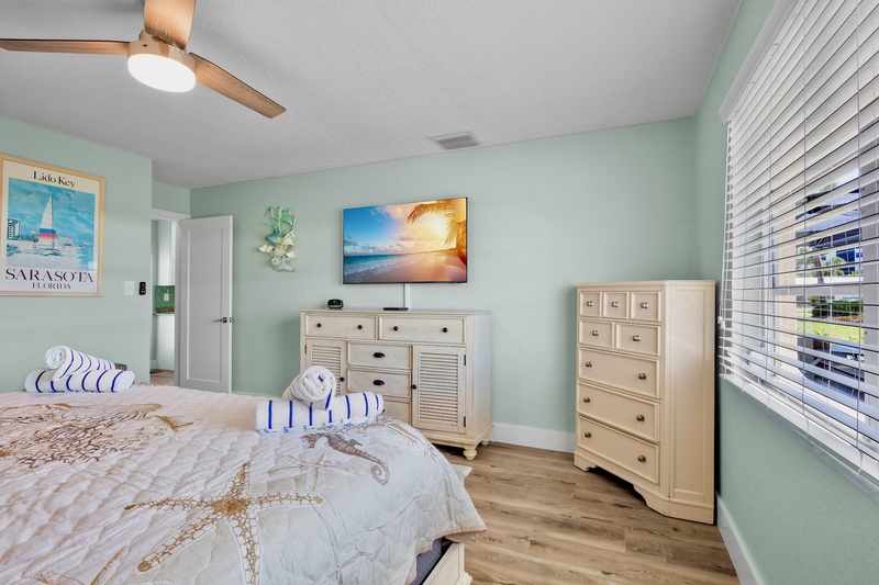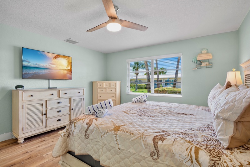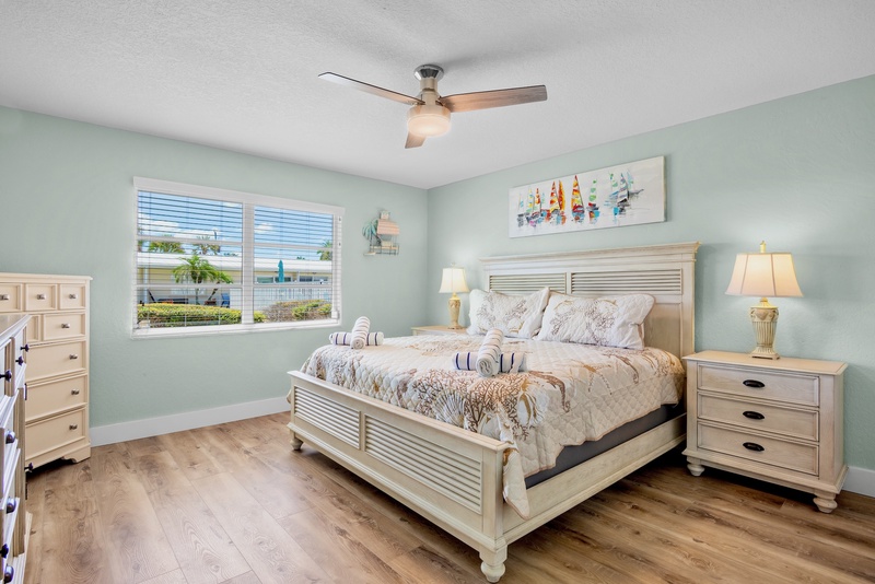The primary bedroom features a king bed, fresh coastal decor, and plenty of storage space for your belongings. The remodeled bathroom includes a walk-in shower with grab bars and a built-in seat for added comfort and accessibility.
