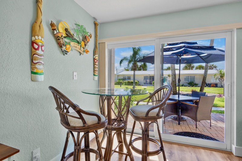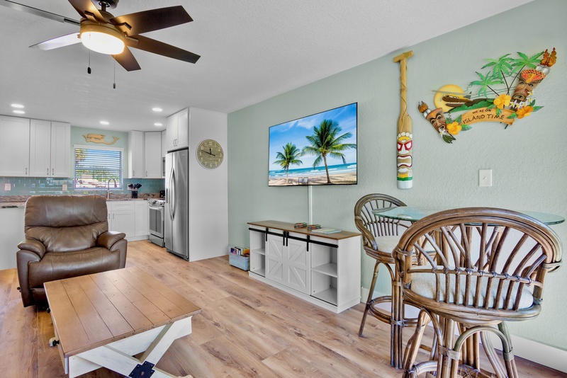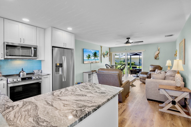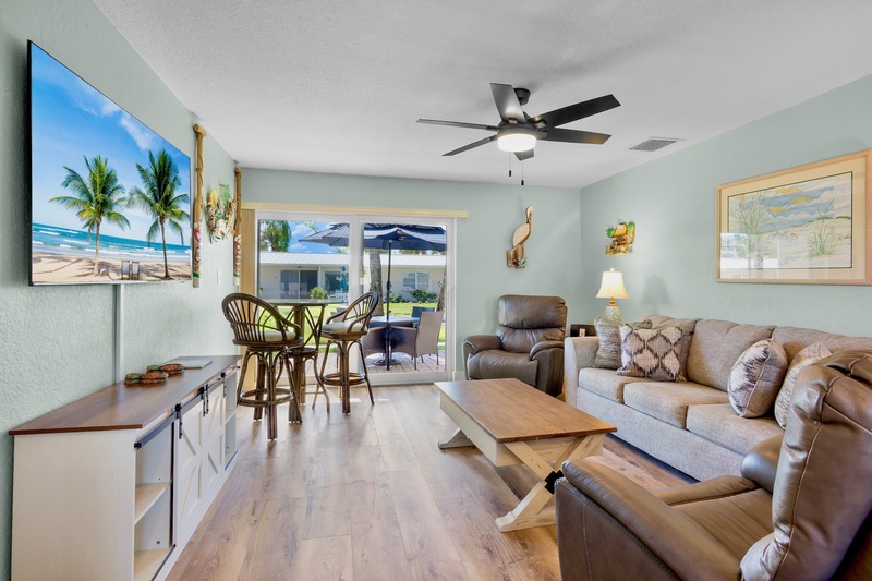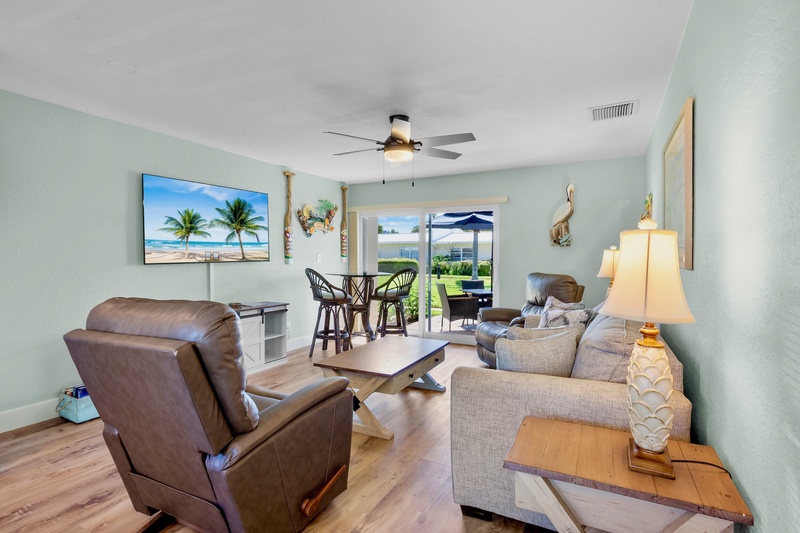Step inside to a bright, open living area featuring comfortable seating, a queen sleeper sofa, and a Smart TV for relaxing evenings. The fully equipped kitchen includes full-size appliances, cookware, and everything needed to prepare meals at your convenience. Sliding glass doors open to the private patio, offering direct access to the pool area and lush tropical surroundings, perfect for morning coffee or evening relaxation.