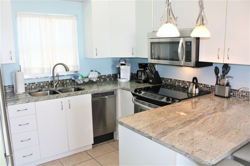"Casual Elegance" can best describe this charming 1 Bedroom, 1 Bath Villa on world-famous Siesta Key Beach. Unit 52 was remodeled recently, and offers a crisp, clean look and vibe for your vacation escape. The unit received numerous upgrades, and comfortably sleeps 2 guests. Everything in the unit is new, including stainless steel refrigerator, dishwasher, stove and microwave, small kitchen appliances, granite counter tops, breakfast bar, dining set, leather sleep sofa, upholstered chairs, coffee and end tables, area rugs, art work, entertainment center, pendant lights, chandelier, ceiling fans, coffee makers, Emeril cookware and knives for the gourmet, toaster oven, telephones, 48" Sony Bravia HD TV, 32 HD TV, king sized bedroom set, high grade mattress and bedding. It's all new, fresh, and bright. The unit overlooks pool #1 (also known as the "quiet pool"), offers brand new pavers in the front and rear of the unit, and features Florida Patio's newest high-end hurricane line of custom made patio furniture, including two recliners, dining table, chairs and umbrella. Unit 52 offers the perfect setting for a couple. The unit also features a stacked GE washer/dryer unit. Some added features that make this unit special include a reverse osmosis water filtration system for the refrigerated drinking water dispensing system and built-in ice maker. No bottled water needed here! And, to facilitate beach time, the unit has folding beach chairs, umbrella and stand, beach toys, noodles, three different sized coolers and multiple ice packs for your use. Since the entire complex is on the "beach side" of the street, you will only need to walk a few minutes to step into the fluffy, white sand - no crossing busy streets! Reserve a great unit in a gorgeous setting today. As many say, this is paradise. Please check out the unit photos to see for yourself! Unit 52, your crisp clean vacation villa; casual elegance. Reserve your time today - either online or contact one of our Rental Agents. Free long distance for USA and Canada. This unit has a 7-night minimum Saturday to Saturday rental policy, but can be booked for less to fill gaps. We will do our best to accommodate any request. Thank you for your interest in Unit 52!