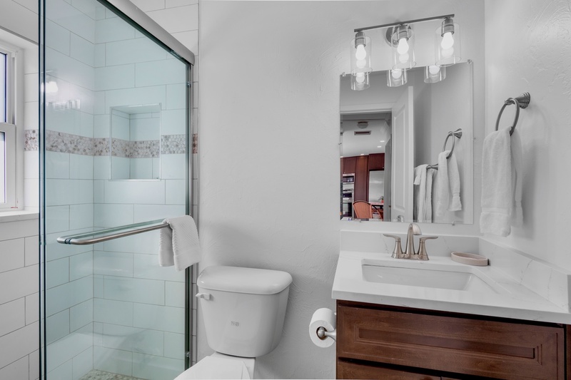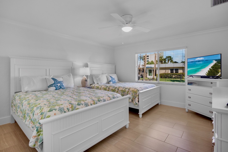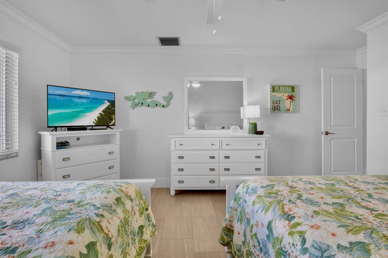 The primary bedroom offers both a queen bed and a full bed, making it ideal for couples or small families. Enjoy a restful night’s sleep surrounded by fresh coastal decor and soft linens. The full bathroom includes a walk-in shower with grab bars for added comfort and accessibility.