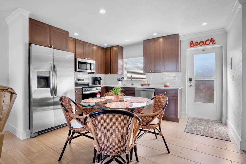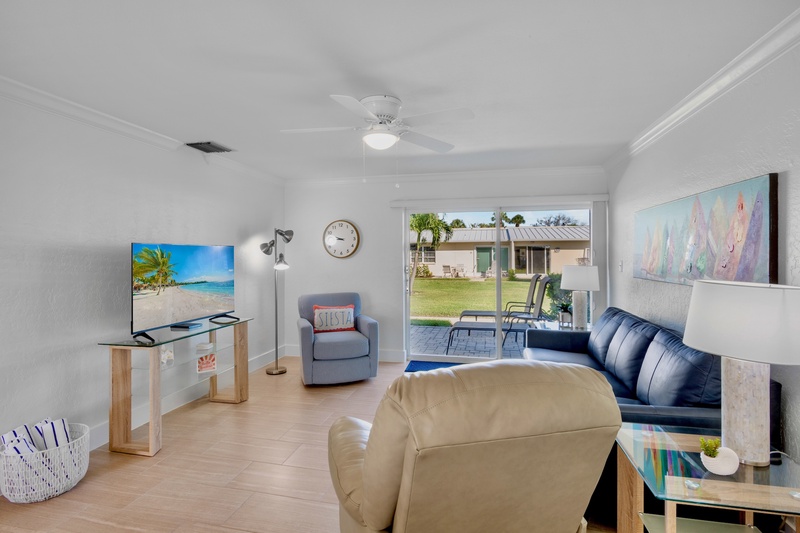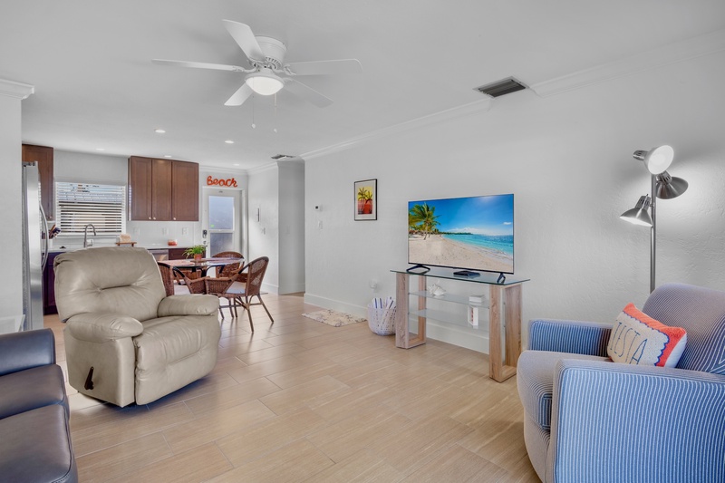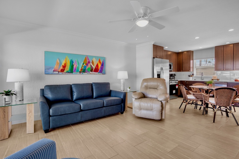 Step inside to a beautifully updated open floor plan with all-new tile, crown molding, paint, and furniture. The living area features a comfortable queen sleeper sofa with a memory foam mattress, a Smart TV, and direct access to the dining area. The fully equipped kitchen includes modern appliances, ample storage, and all the essentials for preparing meals or quick beach snacks. Every detail has been thoughtfully designed to provide a bright, welcoming space for your Siesta Key getaway.