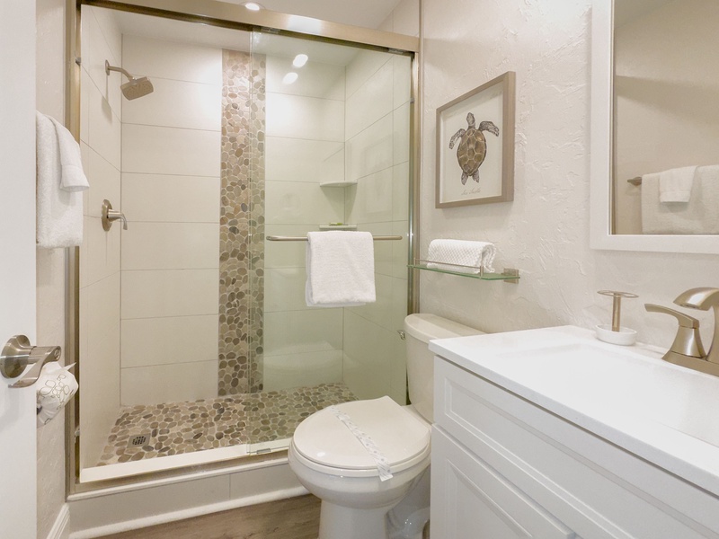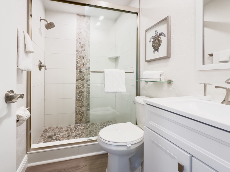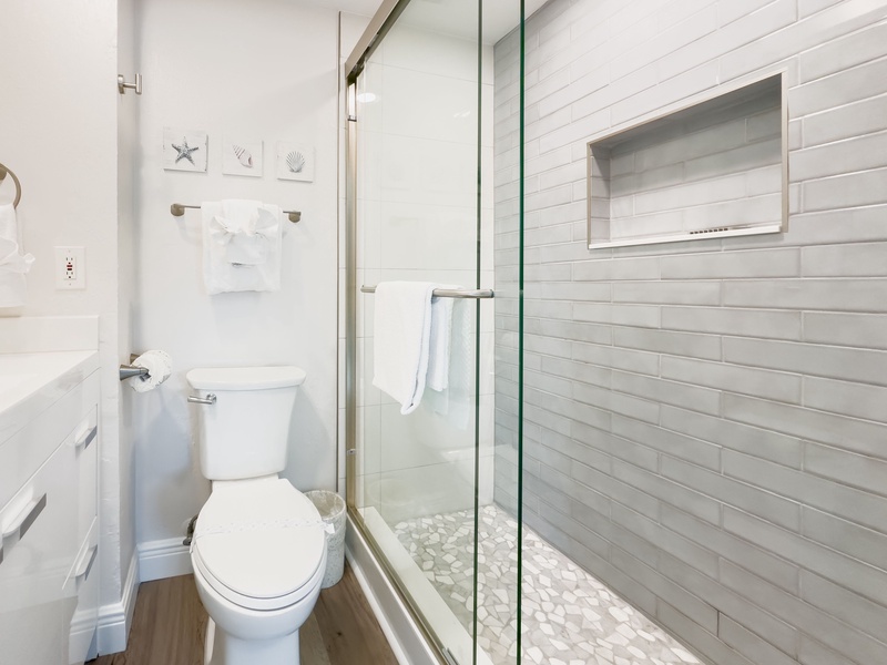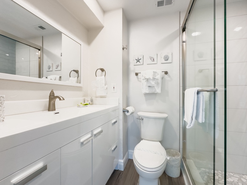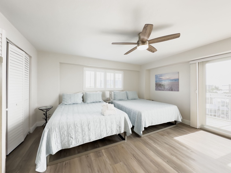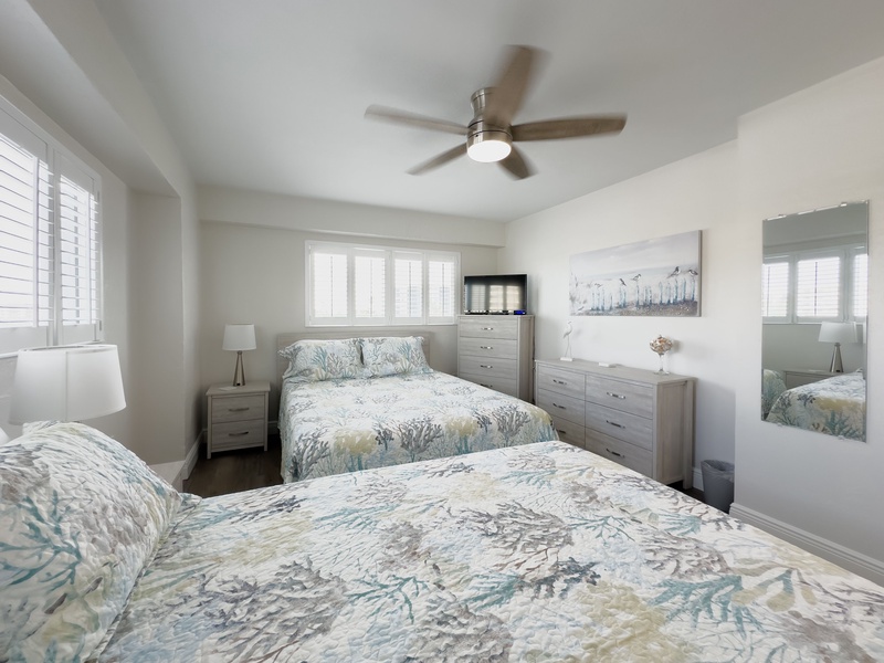 Retreat to the primary bedroom, which features two luxurious queen-sized beds and an ensuite bathroom complete with a walk-in shower for your ultimate convenience and comfort. The Second bedroom offers two queen-sized beds and easy access to the bright second bathroom, also equipped with a walk-in shower.