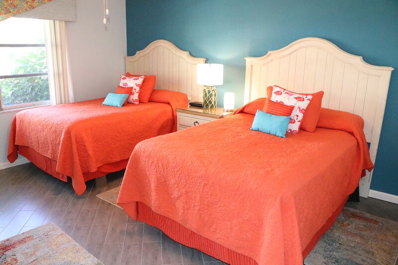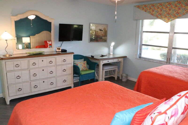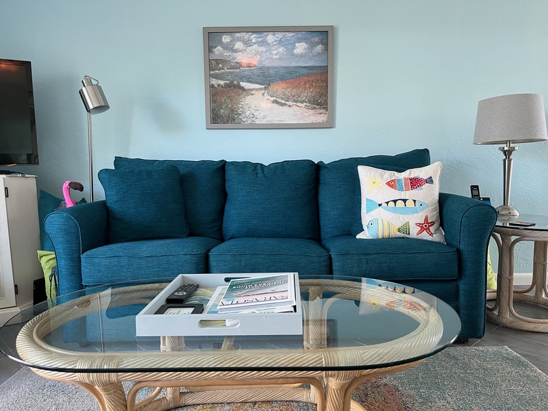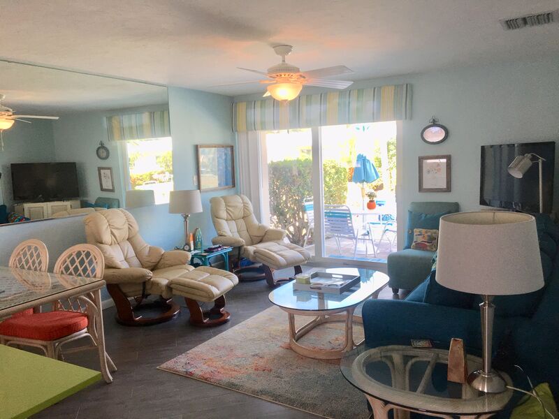 This beachy condo is on the inside esplanade green area. The bedroom a queen size bed, and the televisions in the bedroom and the living room are flat screen. The living room has a new sleeper sofa. Feel free to enjoy any of the 3 heated pools on the grounds, as well as the BBQ at beachside or community patio where there is plenty of seating for a family reunion. You can even play shuffleboard while grilling your dinner. Our community is only a short walk to Siesta Key Beach (1/4 mile) where you can play tennis, volleyball, take yoga classes, or visit the International Sand Sculpting Contest. This unit has a 7 night minimum Saturday to Saturday rental policy, but can be booked for less to fill gaps. We will do our best to accommodate any request.
