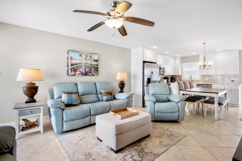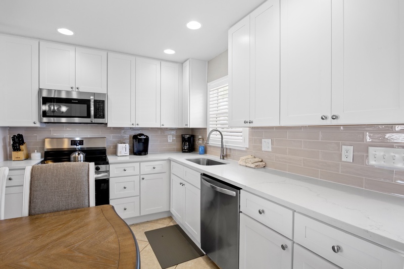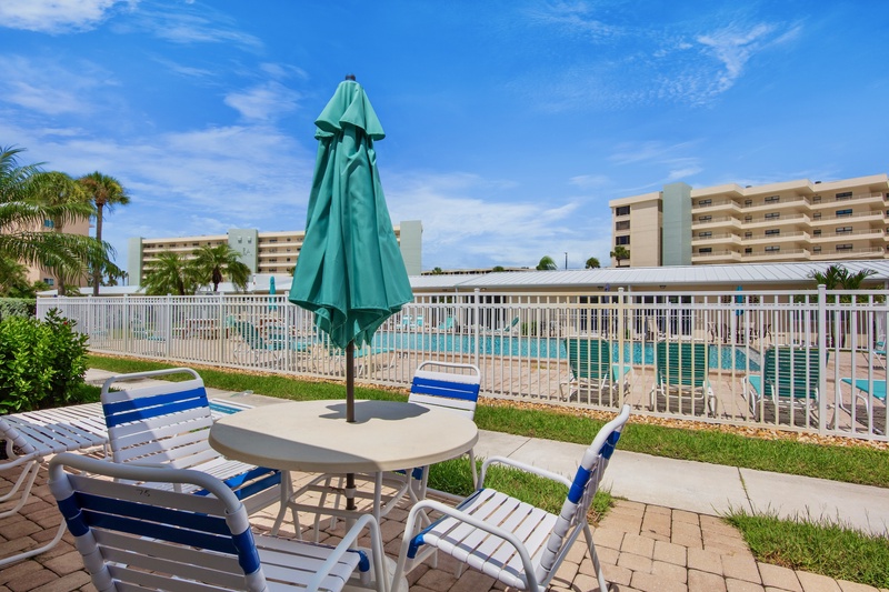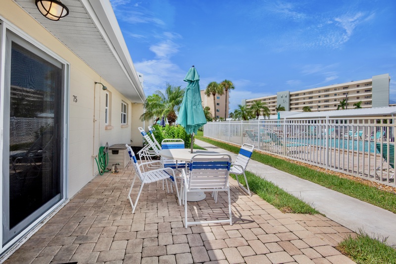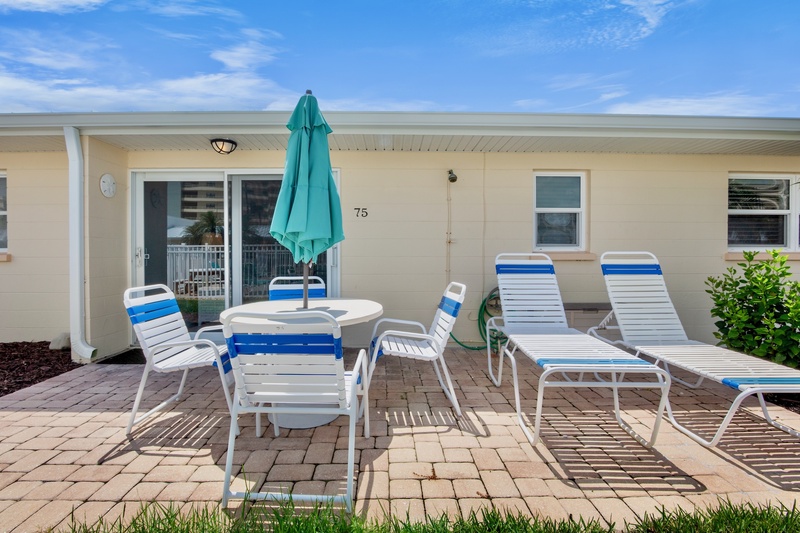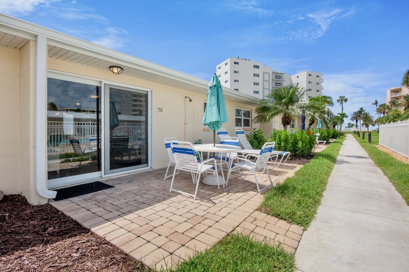 Complete front-to-back renovation with enlarged bathrooms and kitchen. Beautifully appointed 2 bedroom, 2 bath garden villa just steps from the USA's #1 beach. This unit is adjacent to Pool #2 which is a heated, fresh water amenity on our beautifully landscaped property. Kitchen: Gorgeous open concept kitchen with all the small appliances you need. New windows and doors, porcelain floors, granite countertops, and ceiling fans throughout. Master Bedroom: This en suite bedroom features a king size bed, leather recliner, and 22" flat screen TV. The enlarged master bathroom with Roman shower offers a shower seat and grab bar. The granite top sink has a vanity table and makeup mirror. Guest Bedroom: This bedroom contains 2 queen beds, just right for viewing the 26" flat screen TV/DVD. You are welcome to attach your favorite electronic games (gets the kids out of the den). The enlarged guest bathroom has a tub and shower with grab bar. Living Room: Sit on the sofa, loveseat, or rocker-recliners to enjoy the 51" hi-def television with DVD player. Available for your viewing pleasure: HD channels and On Demand movies. The secure, wireless FIOS Internet capability within this unit is available so you do not have to use your data plan. There are also cordless telephones, an answering machine, hair dryers, split garbage/recycle cabinet, beach toys, and beach towels! Kitchen is well stocked with your necessities including a Keurig! Enjoy the enlarged patio with outdoor shower after a day at the beach. Be sure to check out the owner's other units (#75 and #77) next door. All three units have now been renovated to the same comfortable floor plan with all new interiors. This unit has a 7 night minimum Saturday to Saturday rental policy, but can be booked for less to fill gaps. We will do our best to accommodate any request.