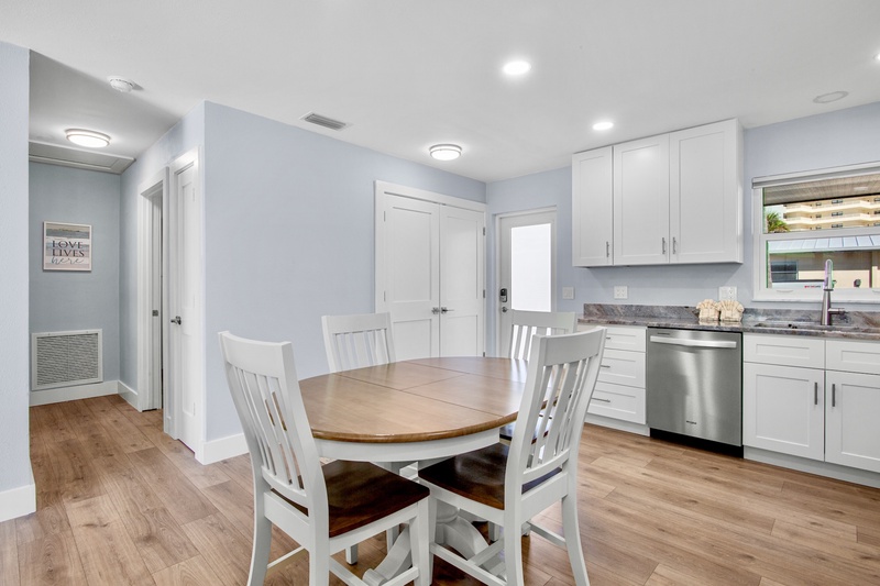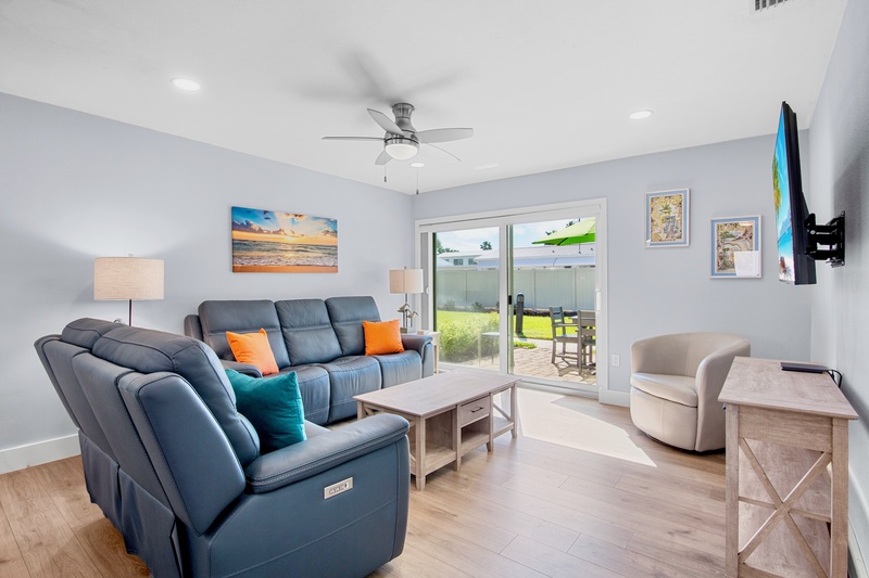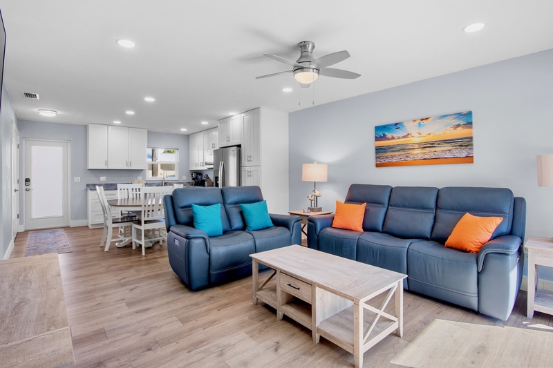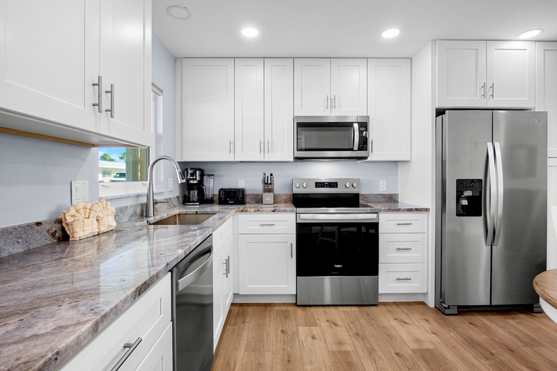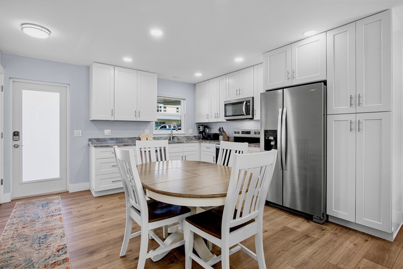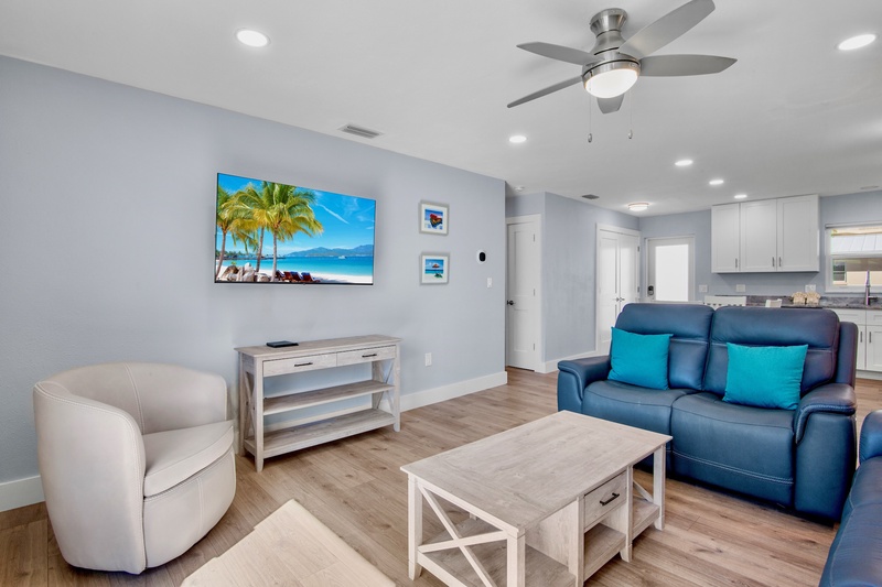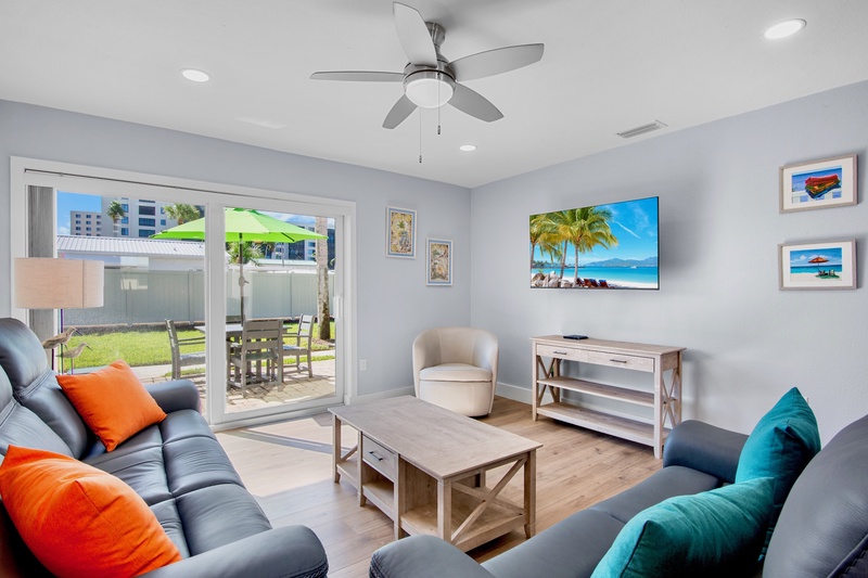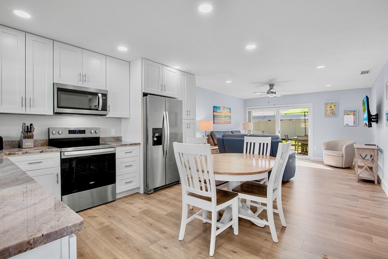 Step inside to a bright, open-concept living area featuring new tile flooring, coastal furnishings, and a 48" Smart TV for relaxing evenings. The fully renovated kitchen showcases granite countertops, custom cabinetry, a tile backsplash, stainless-steel appliances, and updated lighting. A cozy dining space connects the kitchen and living area, creating a welcoming spot for meals or morning coffee before heading to the beach.