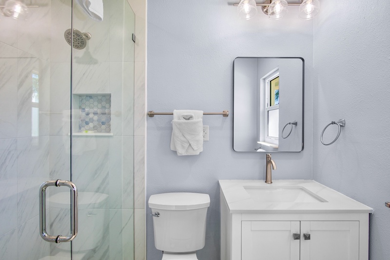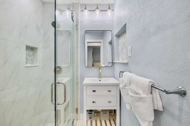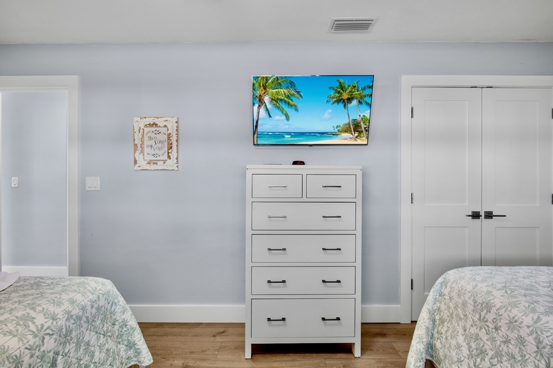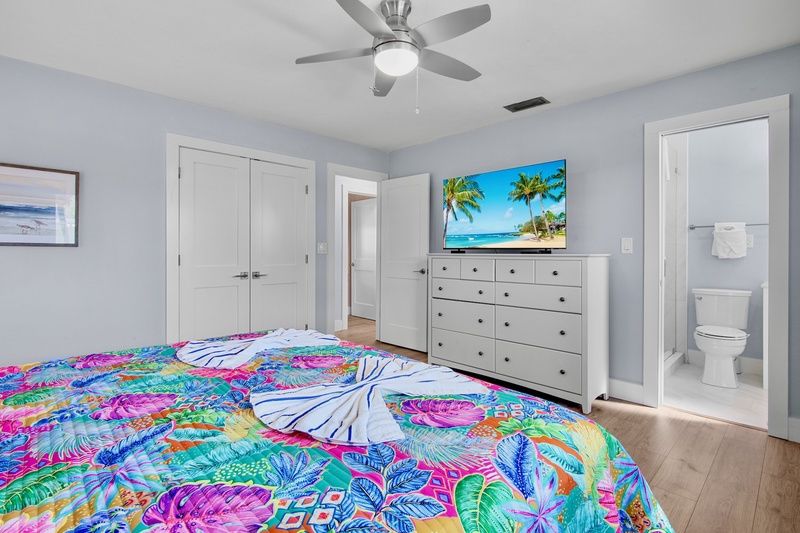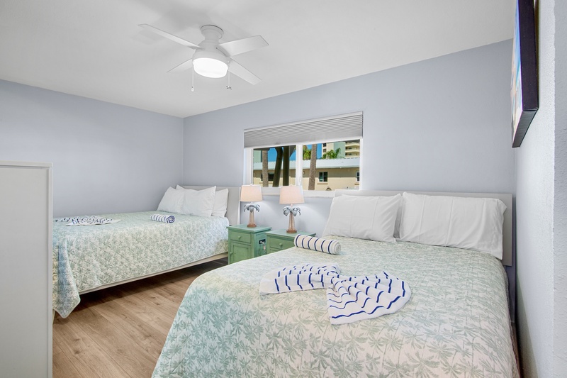 The primary bedroom offers a king bed, TV, and a private ensuite bathroom with a walk-in shower. The guest bedroom features two queen beds, a TV, and access to a second full bathroom, also with a walk-in shower. Both bedrooms include fresh décor, soft linens, and plenty of closet space for your stay.