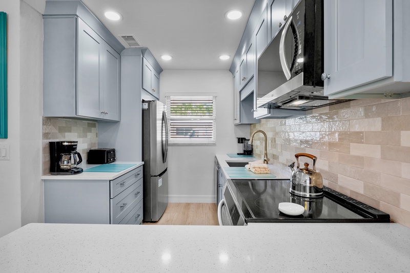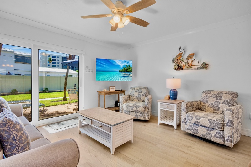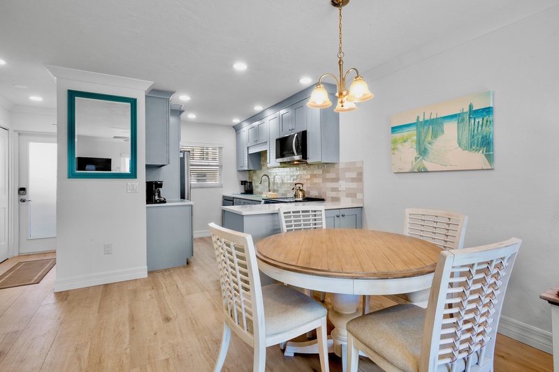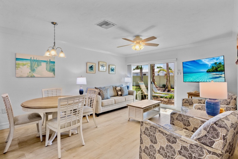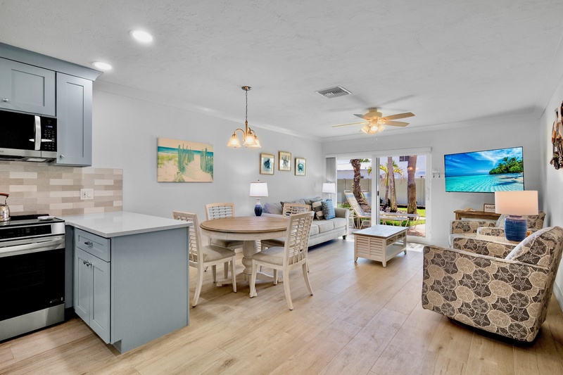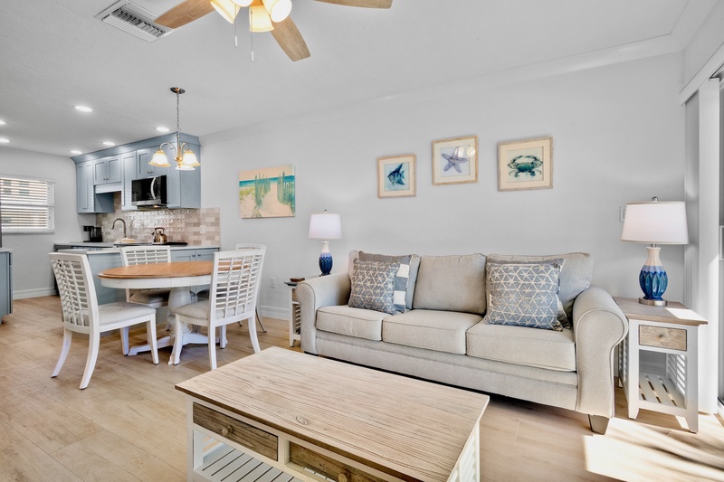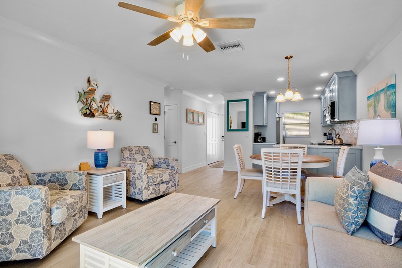 Step into a freshly renovated living space featuring bright coastal decor and a spacious layout designed for relaxation. The open living and dining areas flow seamlessly into the fully equipped kitchen, complete with everything you need to prepare meals during your stay. Large windows fill the space with natural light, and the comfortable seating area provides the perfect spot to unwind after a day of beach adventures.