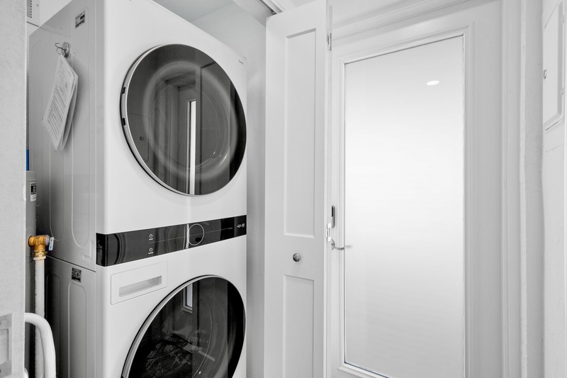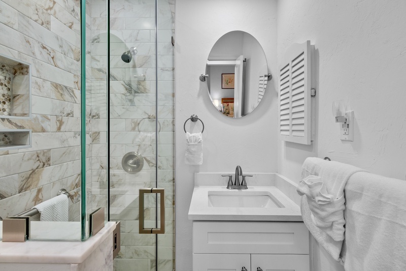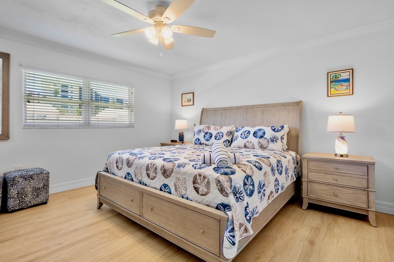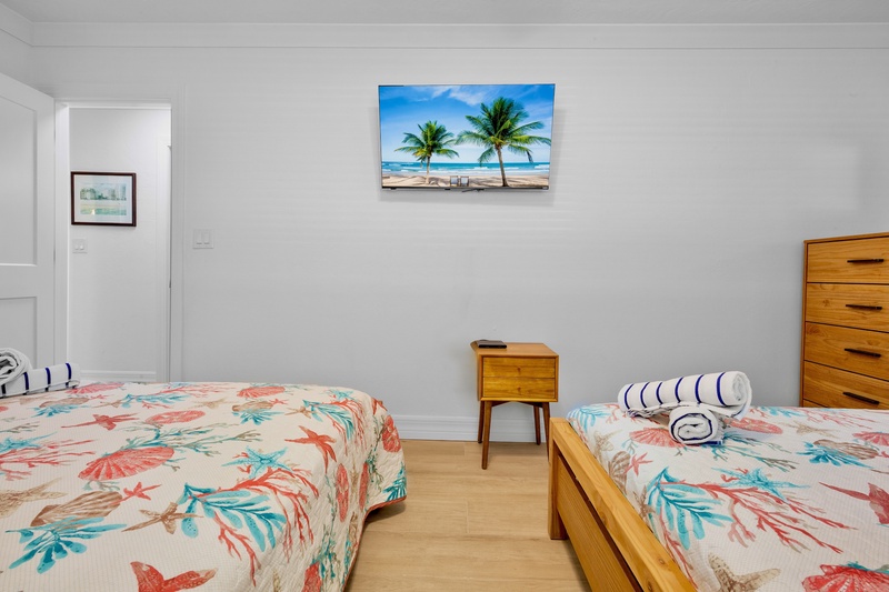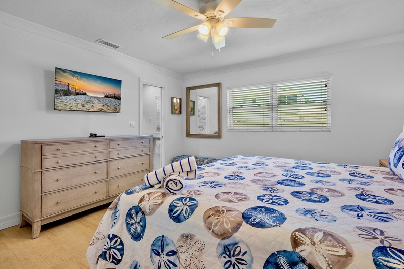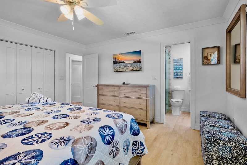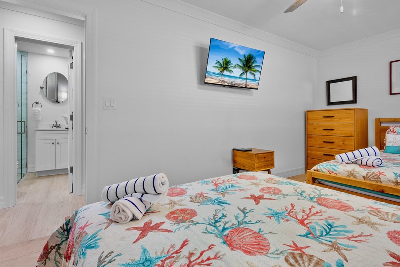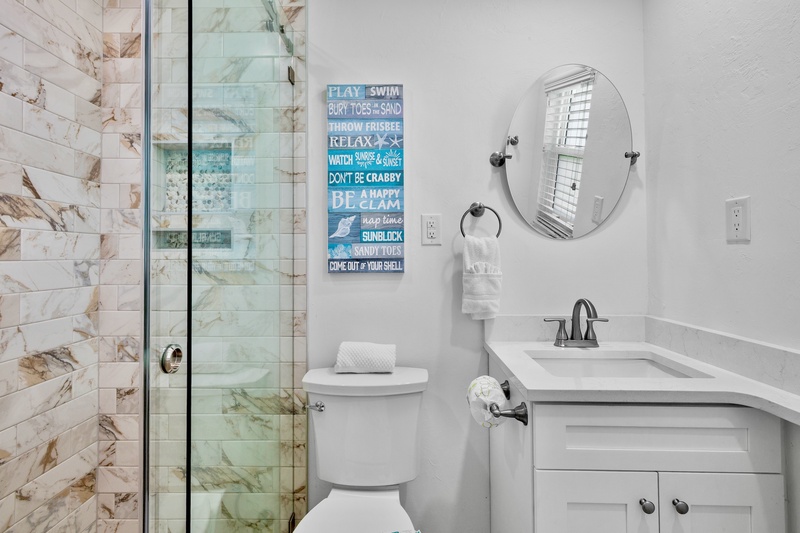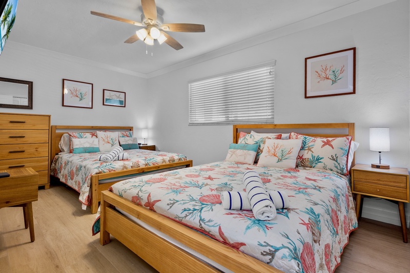 The primary bedroom offers a king bed and an ensuite bathroom with a shower/tub combo, perfect for a relaxing soak after a day in the sun. The guest bedroom includes two full beds and access to a hall bathroom with a walk-in shower, providing plenty of space and comfort for additional guests. Both bedrooms are thoughtfully designed with cozy furnishings and coastal-inspired touches to ensure a restful night’s sleep.
