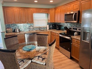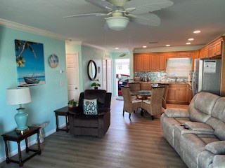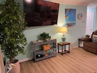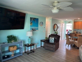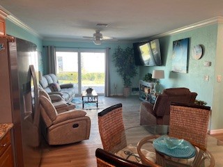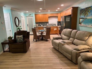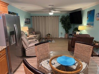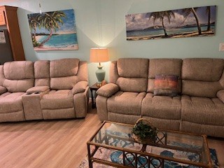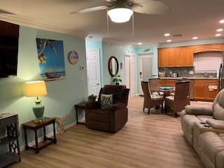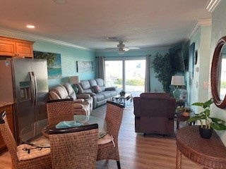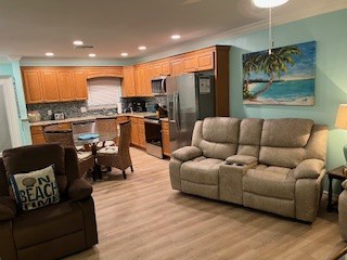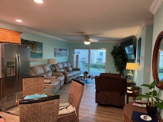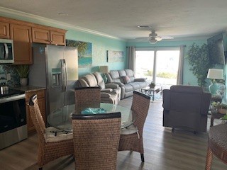 Step inside to find an airy open concept living and dining area designed with coastal charm and modern updates. The comfortable living room offers plush seating, a flat-screen TV, and sliding glass doors that fill the space with natural light and open to a peaceful patio with garden views. The fully equipped kitchen features granite countertops, stainless steel appliances, a Keurig coffee maker, and all the essentials for preparing home-cooked meals, while the glass-top dining table invites four guests to gather for breakfast before heading to the beach.