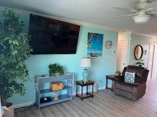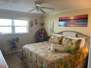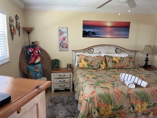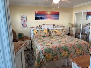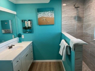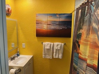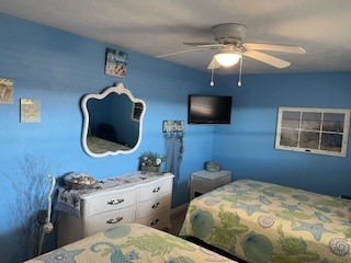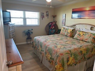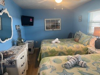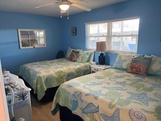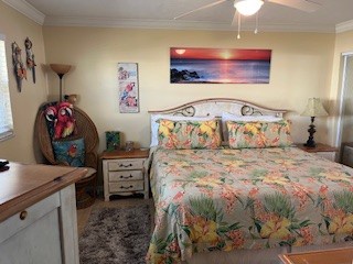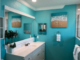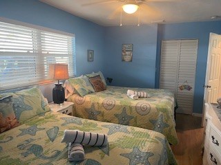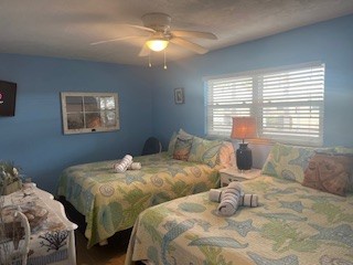 The spacious primary suite boasts a king bed, ample closet space, and a private ensuite bathroom with a walk-in shower and single vanity. The guest bedroom includes two queen beds and easy access to the hallway bathroom, also equipped with a walk-in shower and vanity. Each bedroom offers a TV and plenty of room to unpack and unwind after a day in the Florida sun.