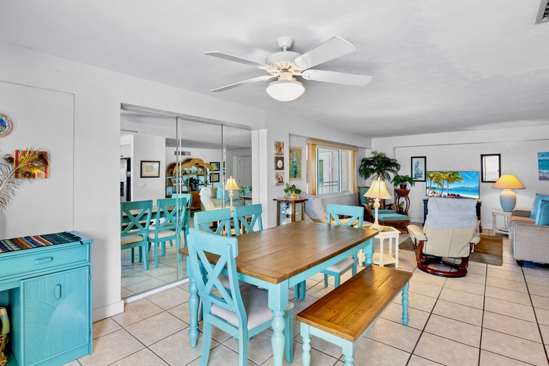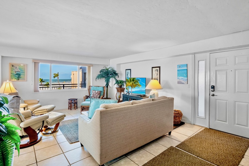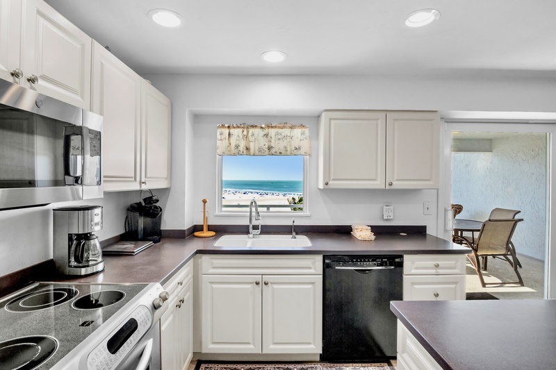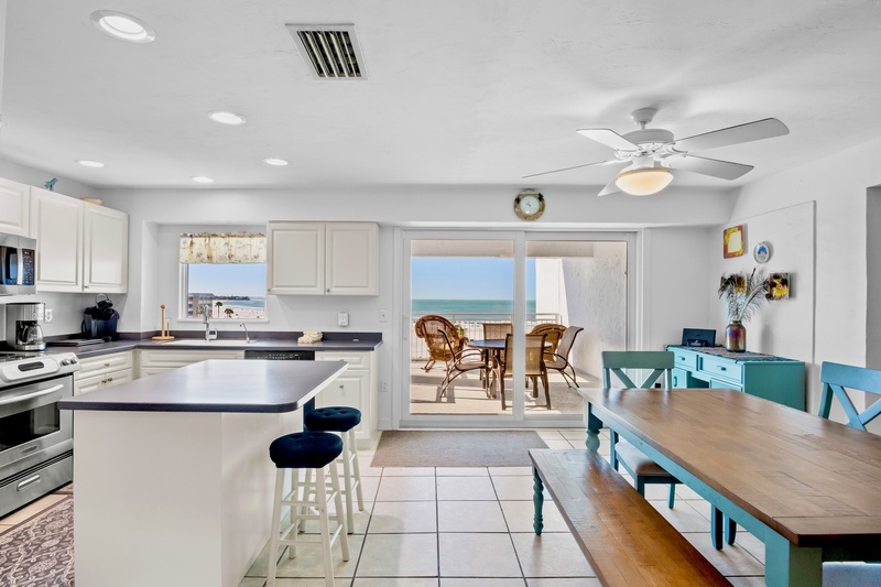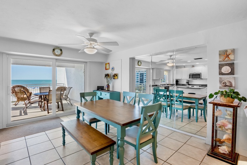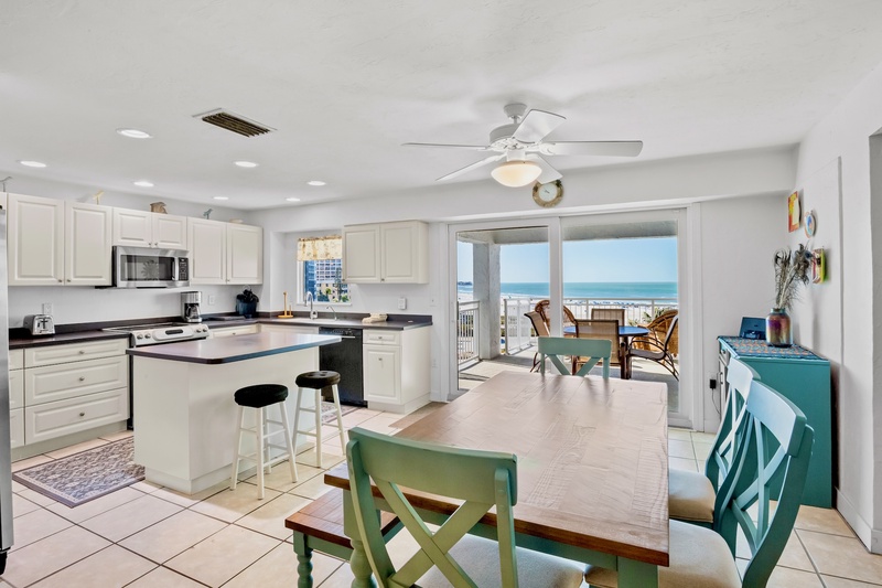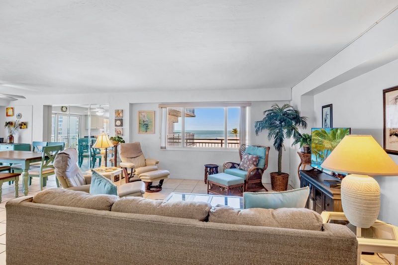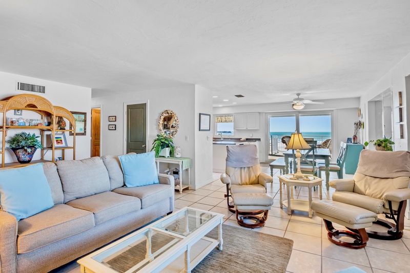 The open living area is bright and welcoming, featuring plush seating, a flat-screen TV, and large windows that fill the room with natural light. The fully equipped kitchen includes modern appliances, ample counter space, and an island with barstool seating, while the dining table offers a comfortable space for family meals with Gulf views as your backdrop. Sliding doors open to the balcony, creating a seamless indoor-outdoor flow that captures the essence of beachfront living.