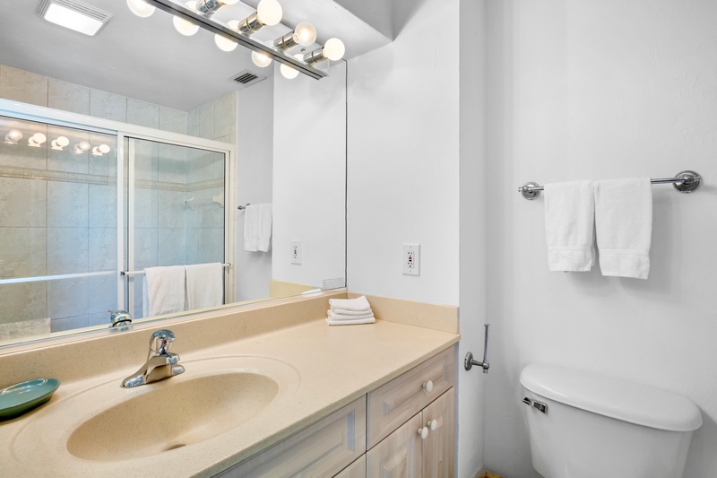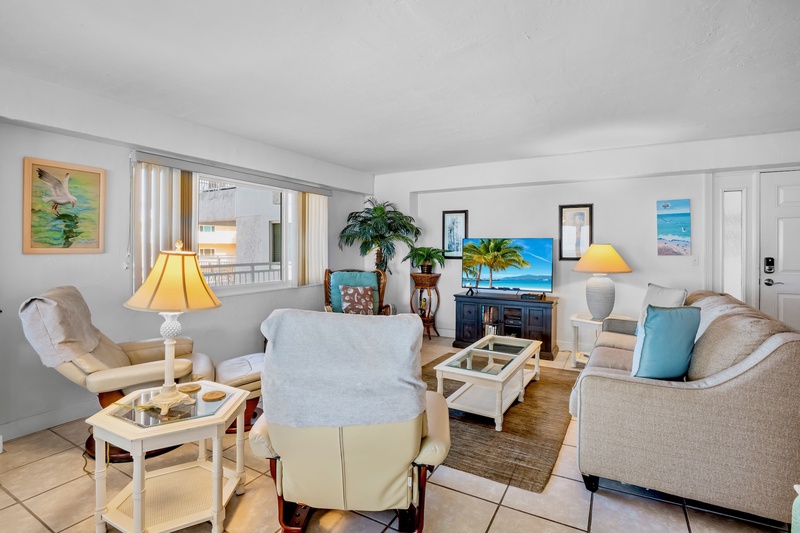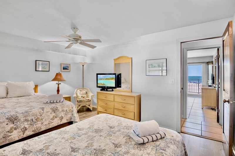 The primary bedroom offers a king bed, flat-screen TV, and private balcony access with incredible Gulf views. The ensuite bathroom features a walk-in shower and plenty of storage space. The guest bedroom includes two full beds and a flat-screen TV, perfect for kids or additional guests. A second bathroom with a walk-in shower ensures everyone has room to refresh after a day in the sun.