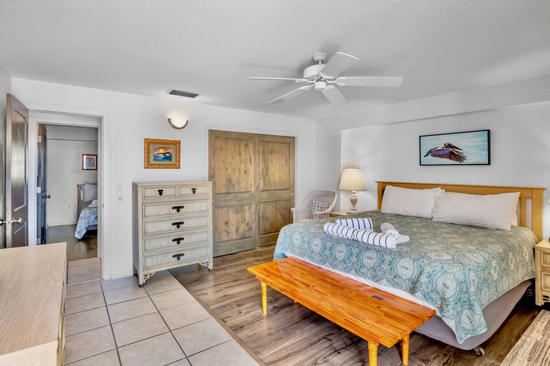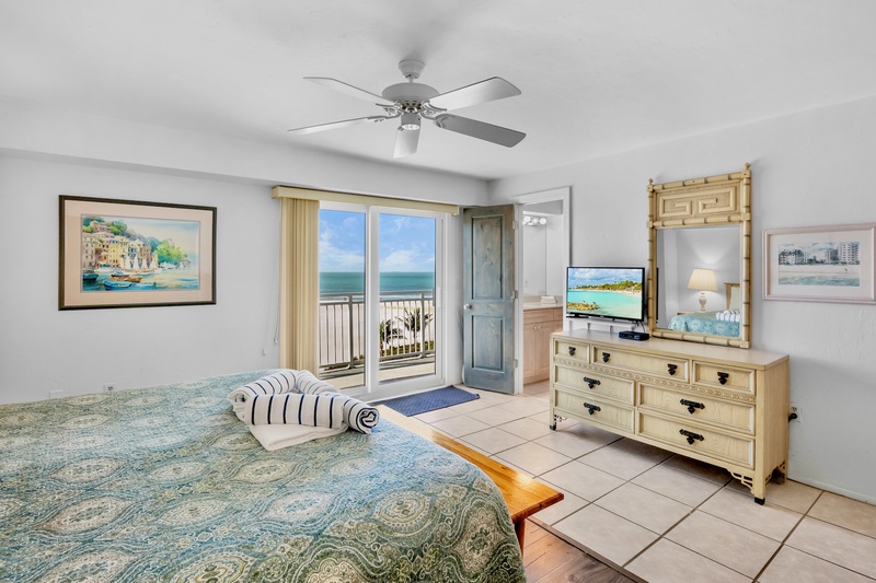 • Primary Bedroom: King bed, balcony access, ensuite bathroom with walk-in shower