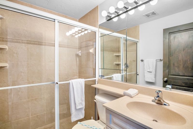 • Guest Bedroom: Two full beds, TV, and hallway bath with walk-in shower