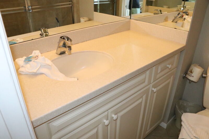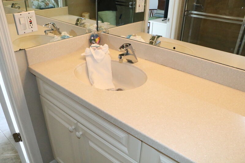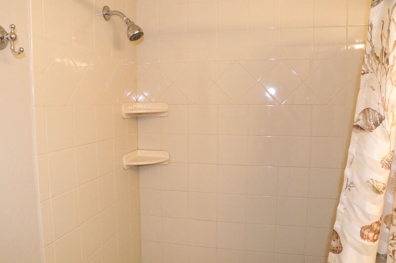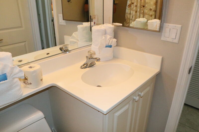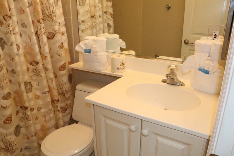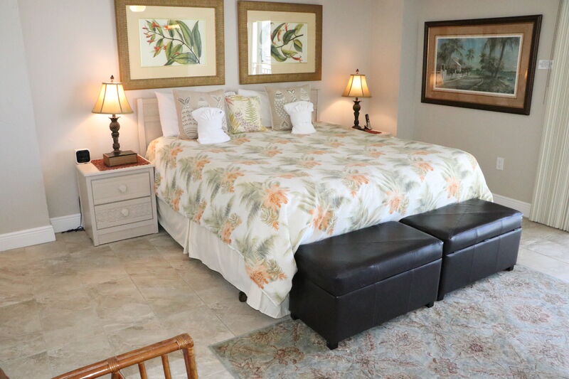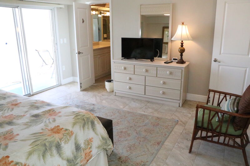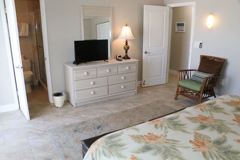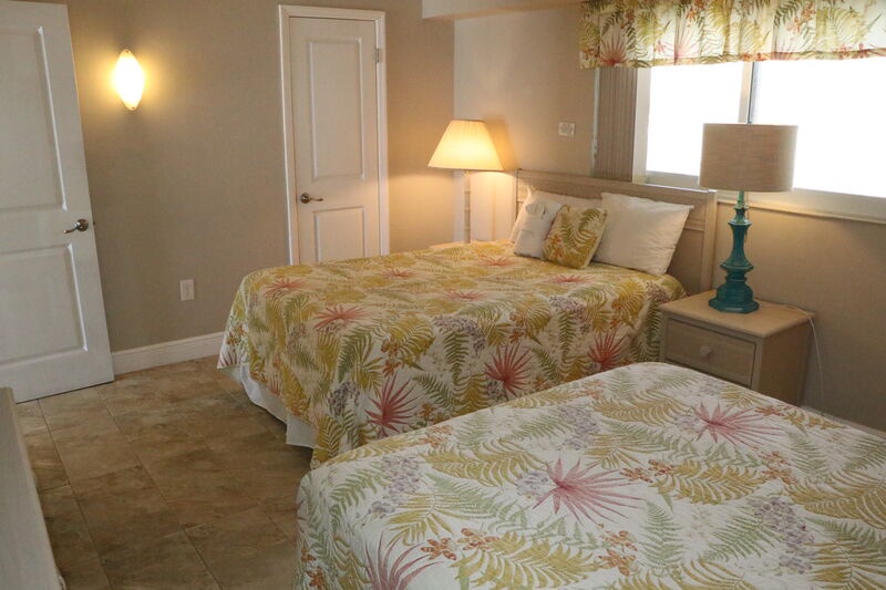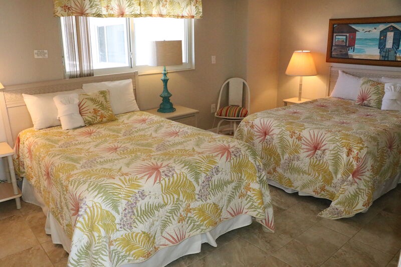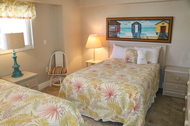 The primary bedroom features a tropical-inspired bedroom with a king-size bed and glass sliders that extend along the length of the room, providing incredible views and natural light. The attached primary bath boasts a spacious walk-in shower and a dual sink granite vanity beneath a full glass picture window that frames the stunning beach view. The guest bedroom is furnished with two full beds providing ample space for family or friends, and has easy access to the hall bath with a shower-tub combo.