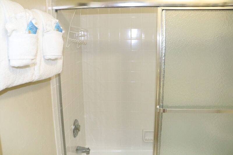 Each bedroom is designed with two full beds, ideal for friends traveling together. The primary bedroom features an ensuite bathroom with a walk-in shower, while the hall bathroom includes a convenient shower-tub combo.
