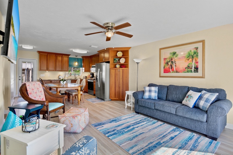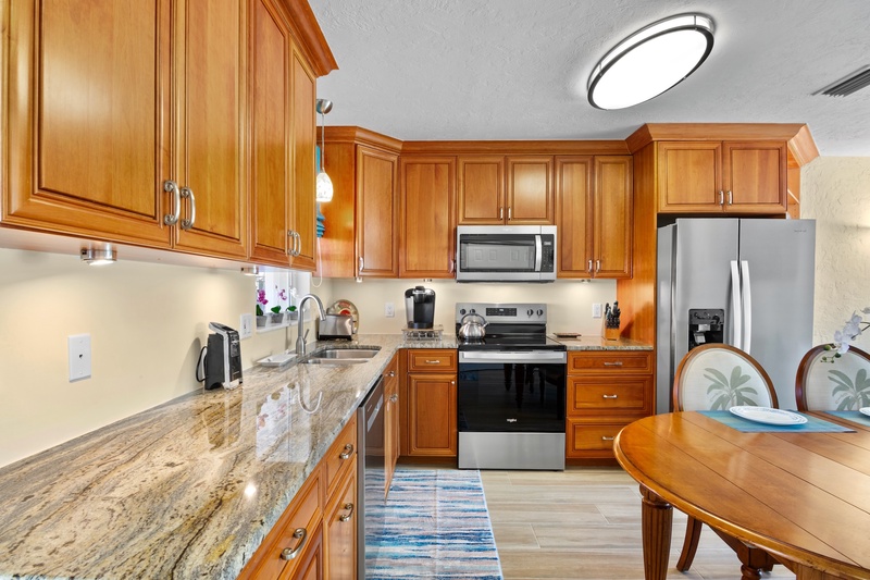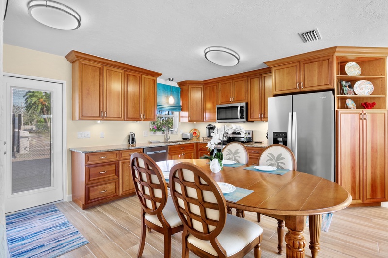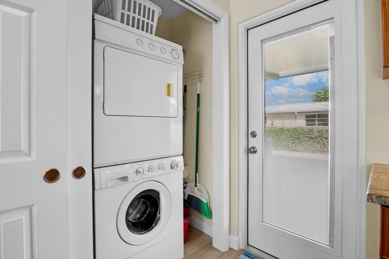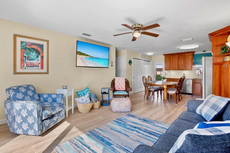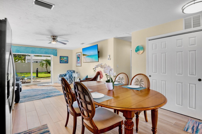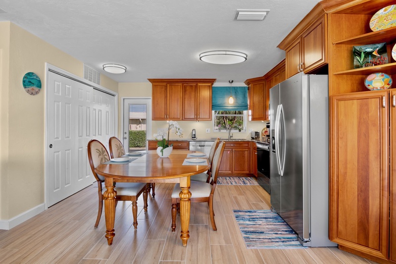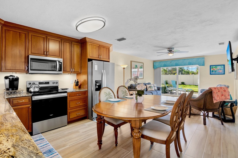 The main living area is bright and inviting, with tropical decor and plenty of seating. A round dining table expands to seat up to eight guests, while the kitchen boasts stainless appliances, a dishwasher, and all the essentials for preparing meals at home. The spacious utility closet includes a washer and dryer for added convenience.