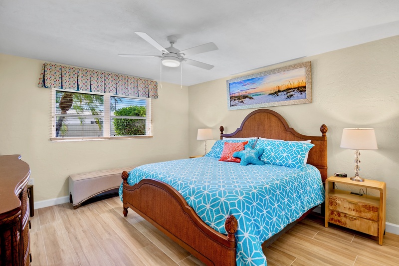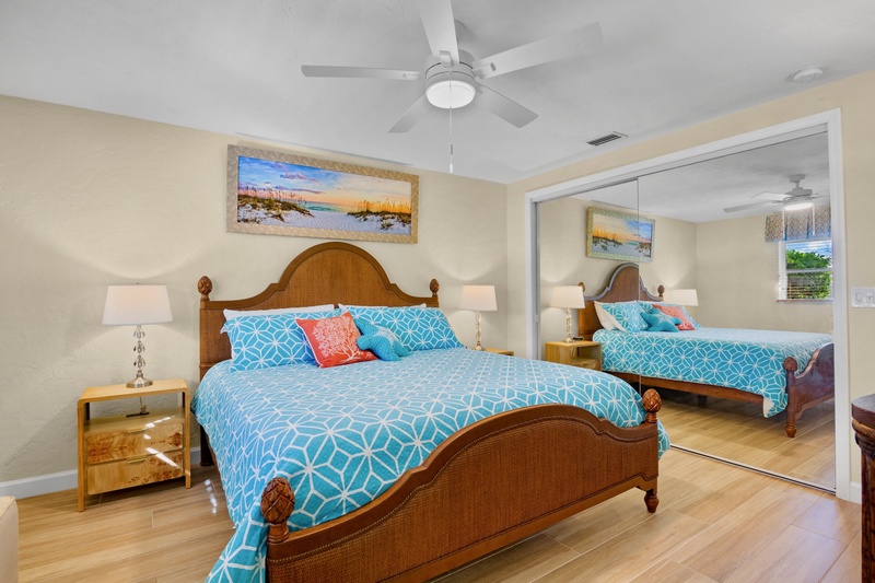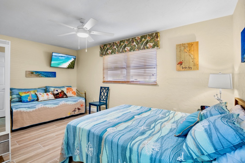 The primary suite features a king bed, large closet, and ensuite bath with a walk-in shower. The guest bedroom is ideal for families, offering a queen bed plus a twin daybed with trundle that can convert into a king. Both bedrooms include wall-mounted drying racks for beach towels and swimsuits. A second bathroom with a walk-in shower is located in the hallway.