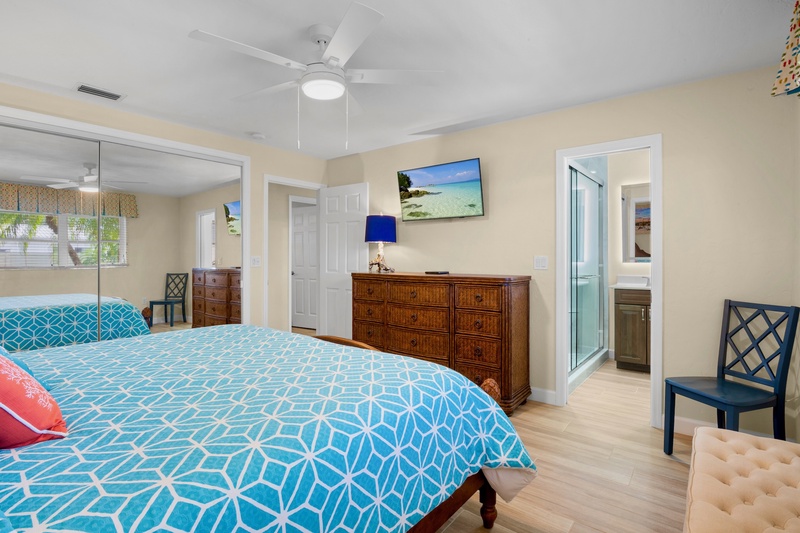 • Primary Bedroom: King bed, ensuite bathroom with walk-in shower