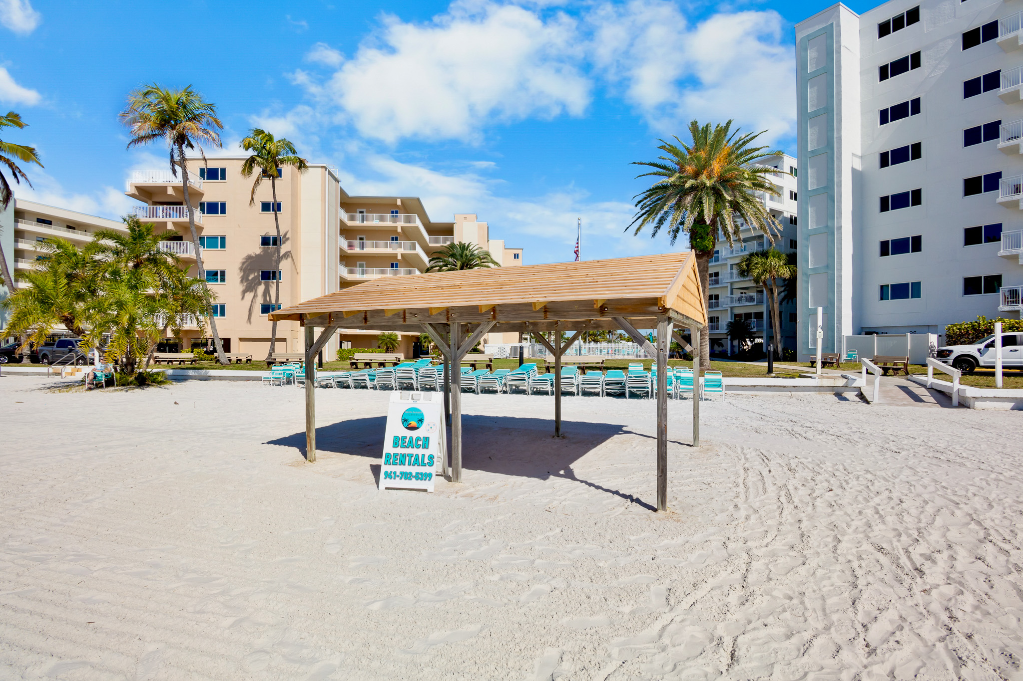 - Shaded cabanas are available for rent. Please contact Siesta Seaside Services at (941) 702.5399.
